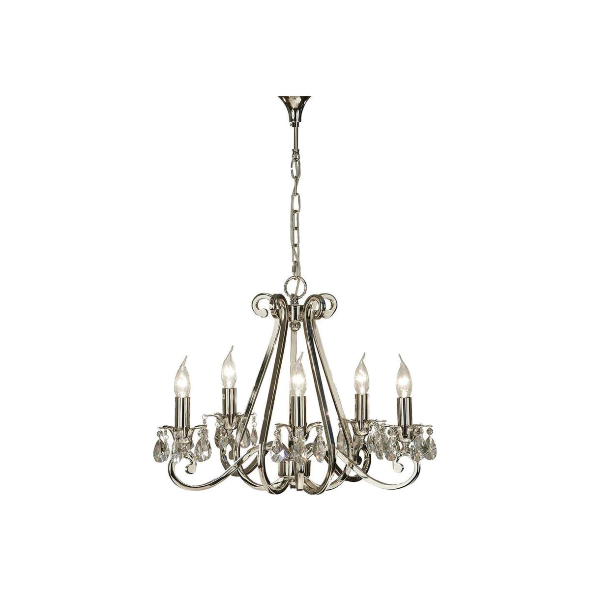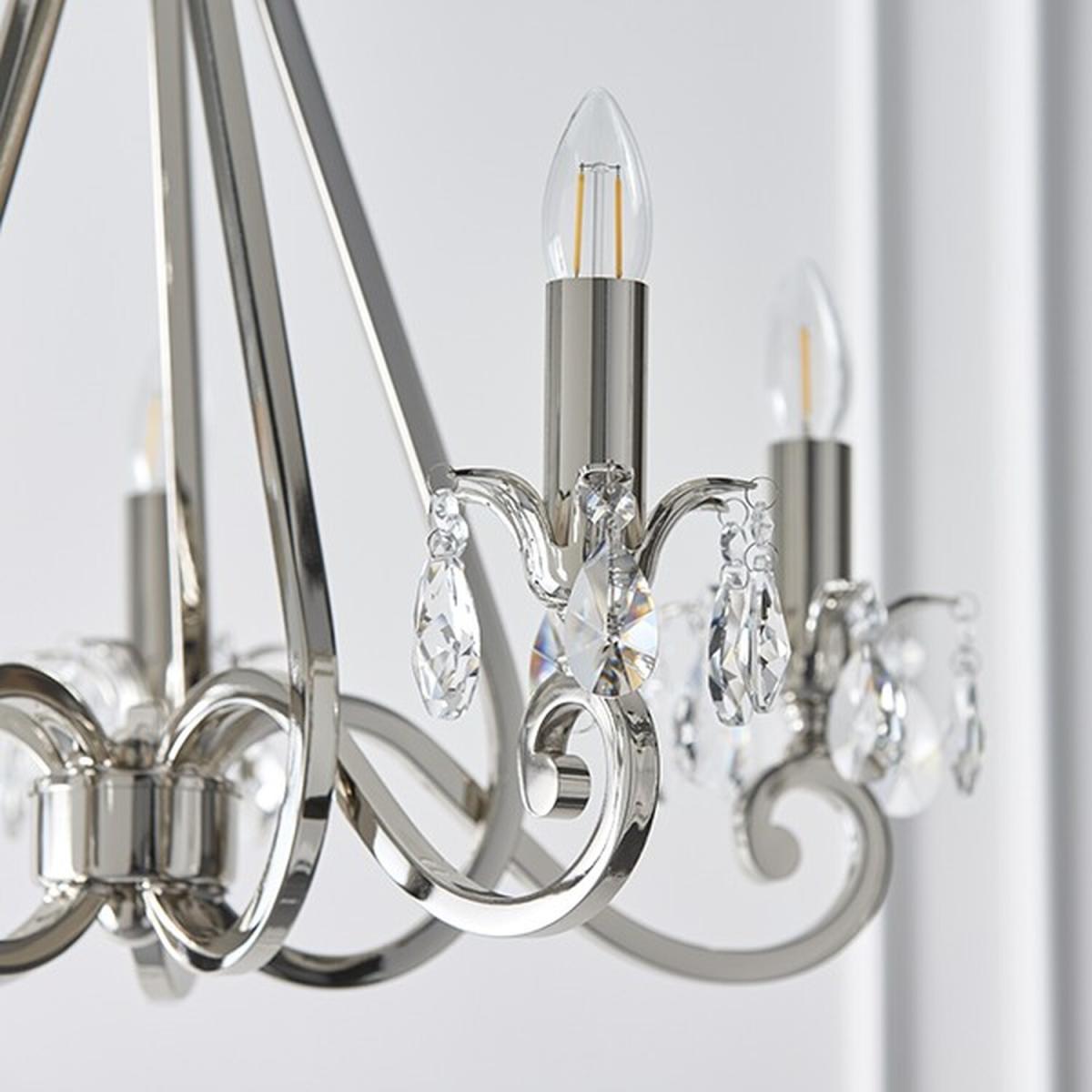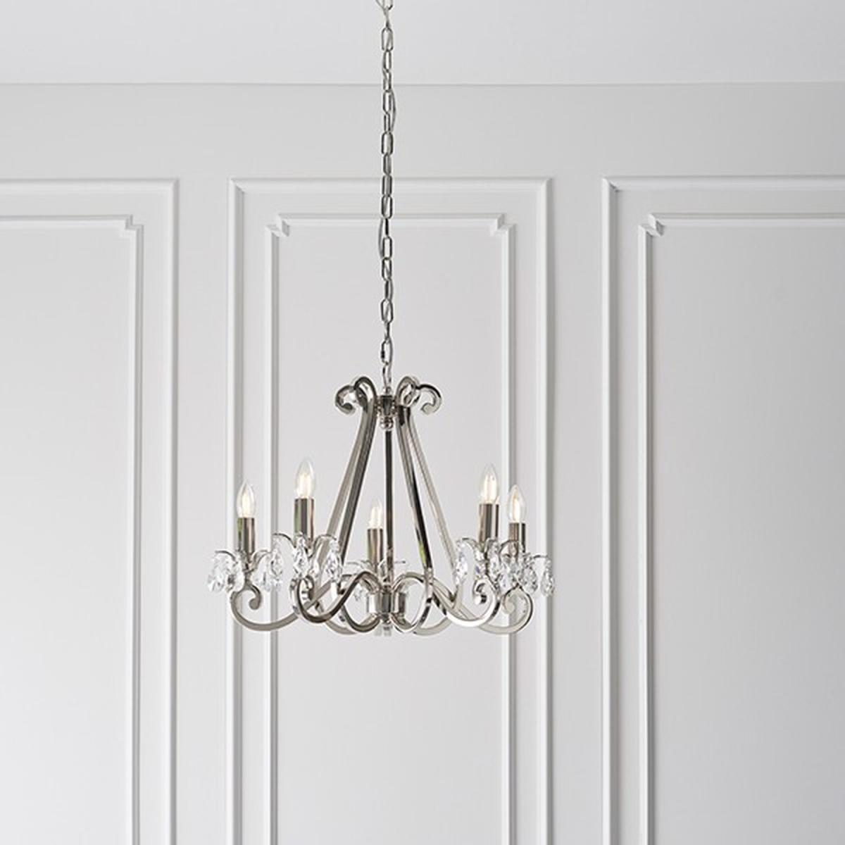 A five light pendant from the nickel range. Features faceted lead crystal droplets around the lamp holder on each decorative arm. Matching items available and compatible with LED lamps.