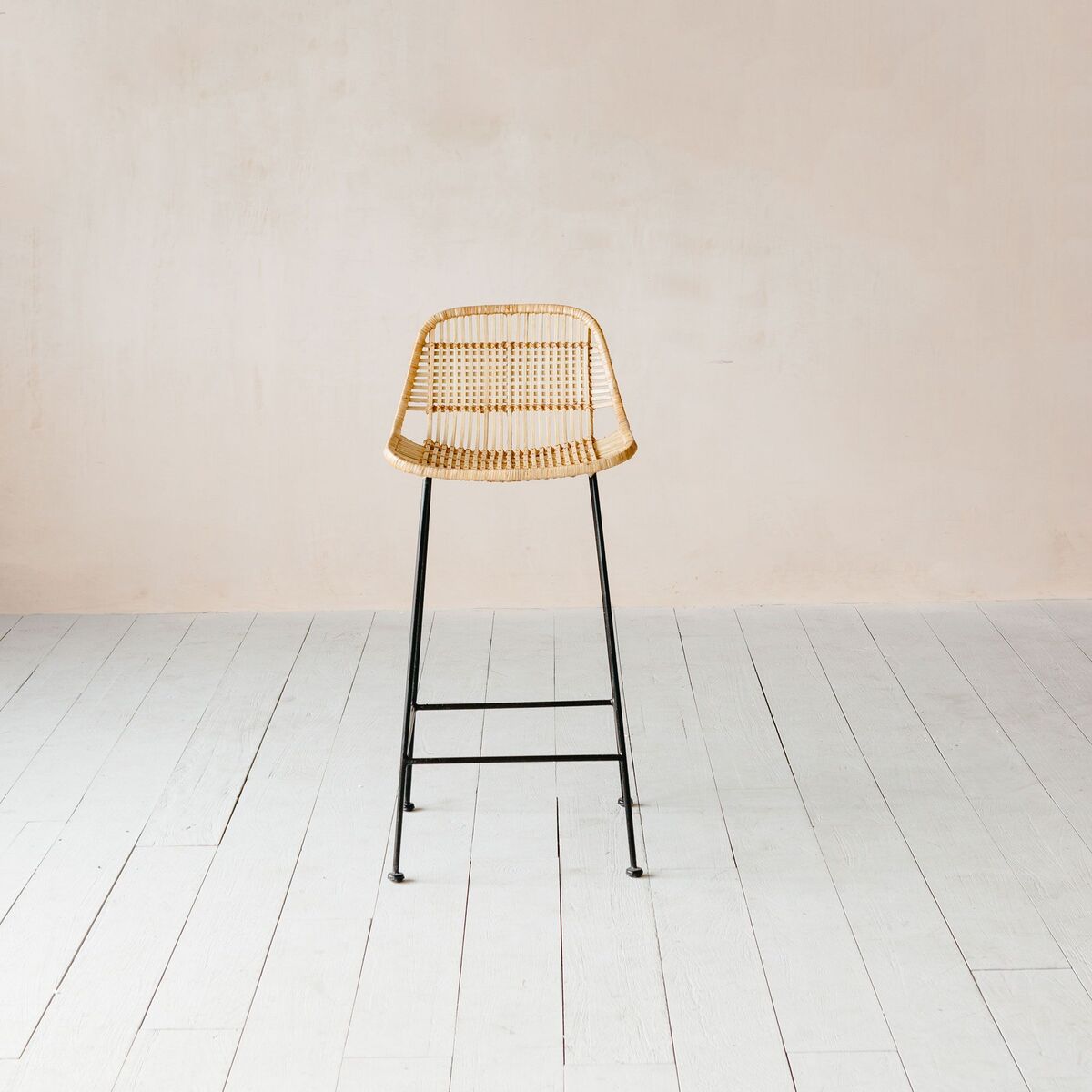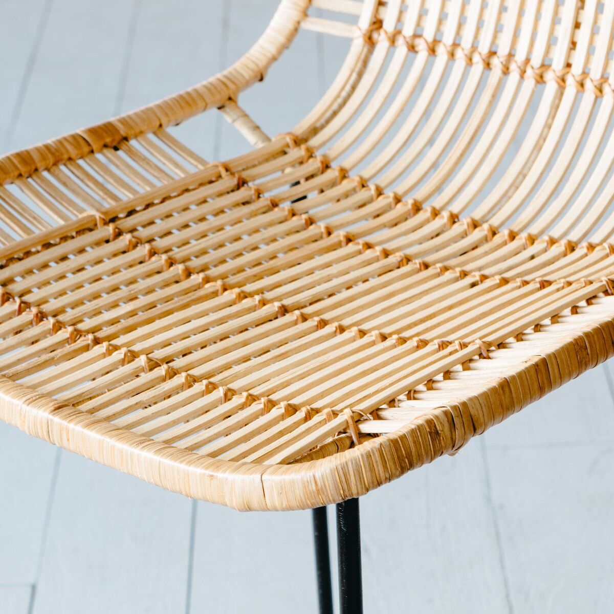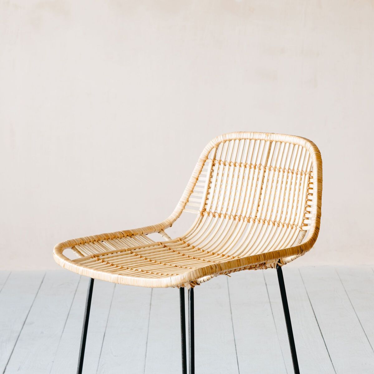 Natural rattan is woven into a graphic silhouette and paired with wrought iron legs to create a cosy curved seat. Pair with soft cream coloured sheepskin for a modern bohemian look. H93. 4 x W43. 5 x D49. 3cm. Made of rattan and wrought iron. Seat height: 70. 2cm. Wipe with a clean dry cloth. Due to the natural quality of this product, size, colour and pattern may vary.