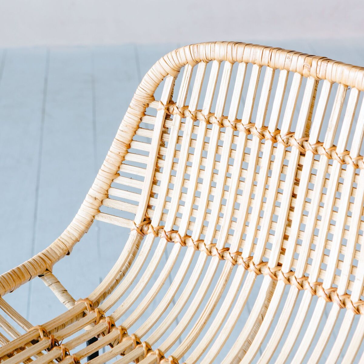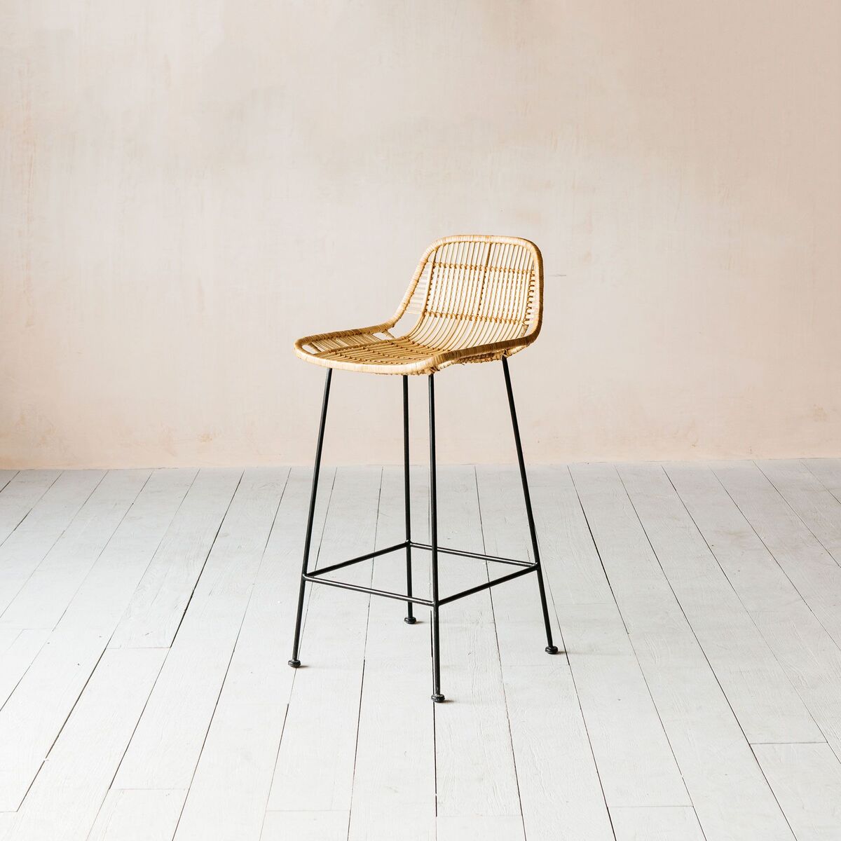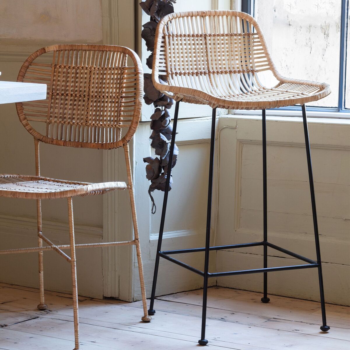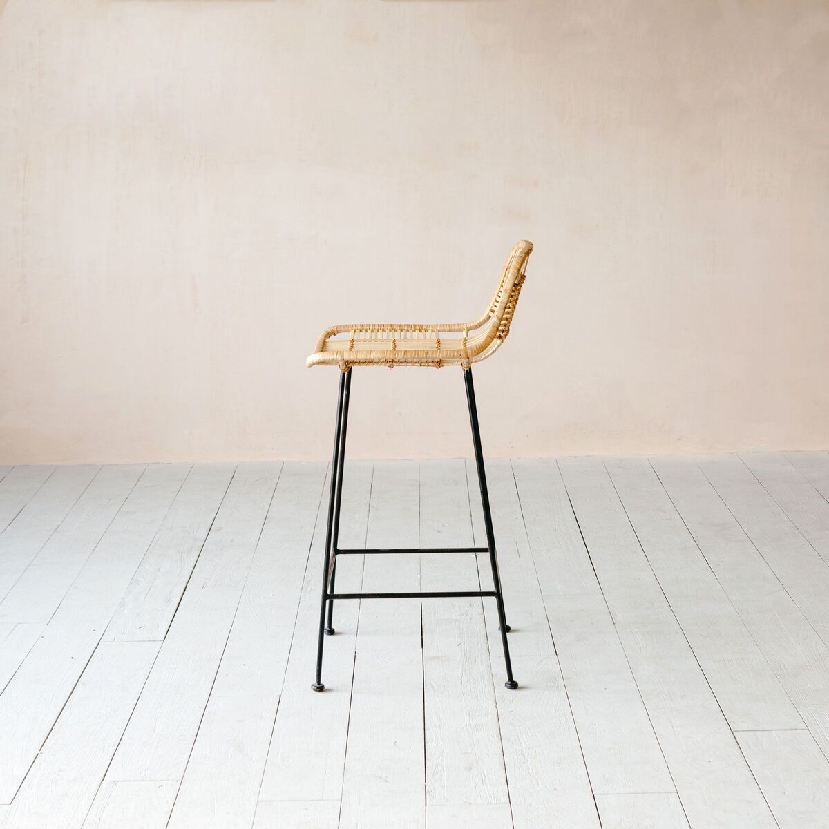 Natural rattan is woven into a graphic silhouette and paired with wrought iron legs to create a cosy curved seat. Pair with soft cream coloured sheepskin for a modern bohemian look. H93. 4 x W43. 5 x D49. 3cm. Made of rattan and wrought iron. Seat height: 70. 2cm. Wipe with a clean dry cloth. Due to the natural quality of this product, size, colour and pattern may vary.