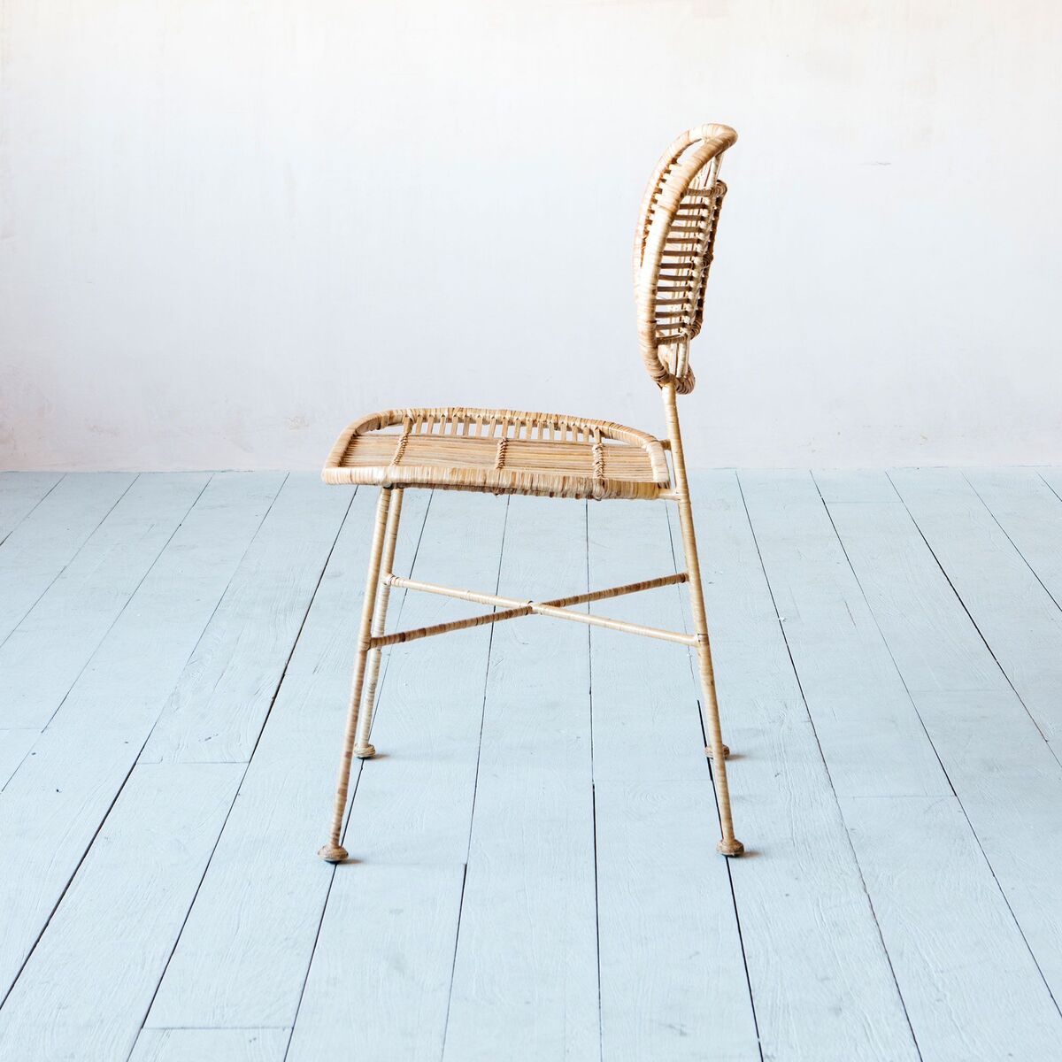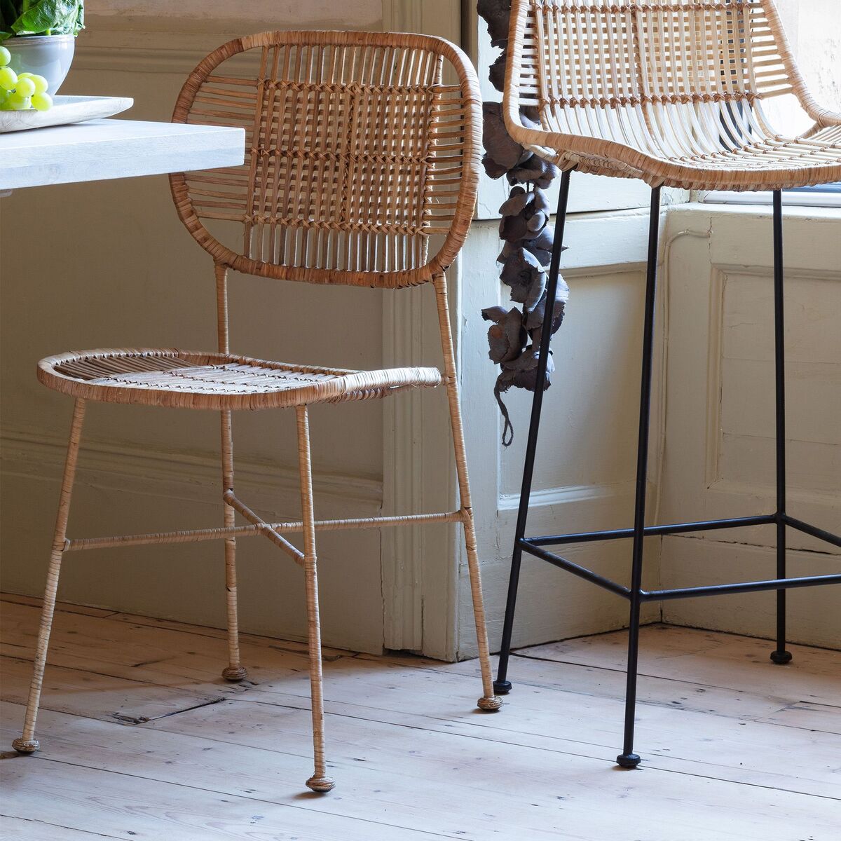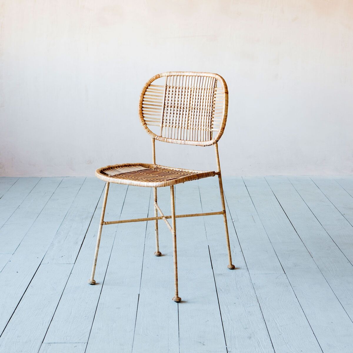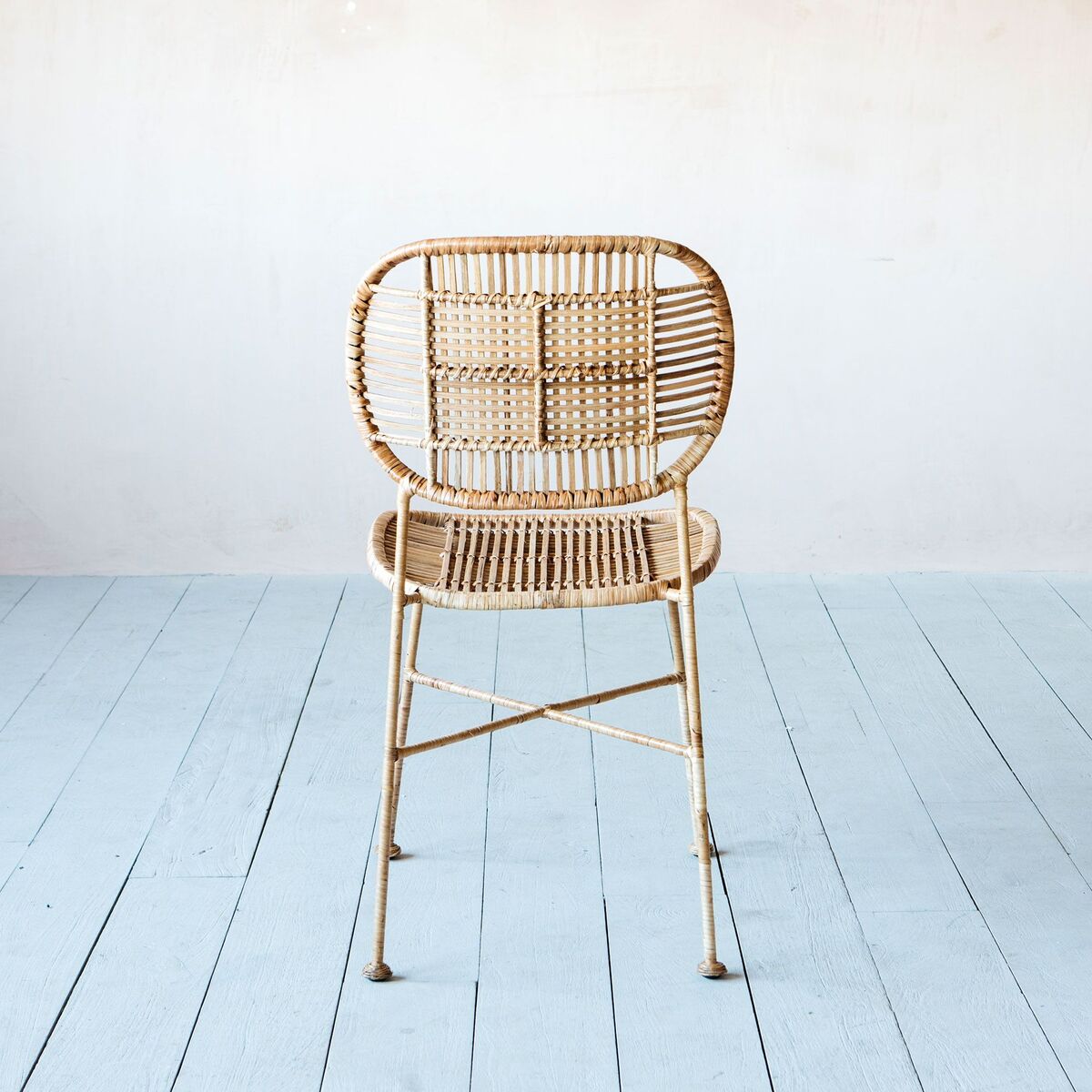 Geometrically woven to create a graphic silhouette and paired with wrought iron legs, this natural rattan chair will complement contemporary and bohemian dining styles alike.