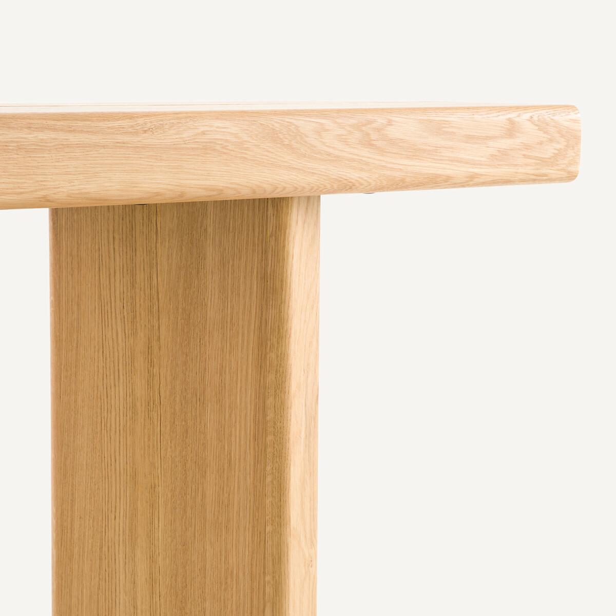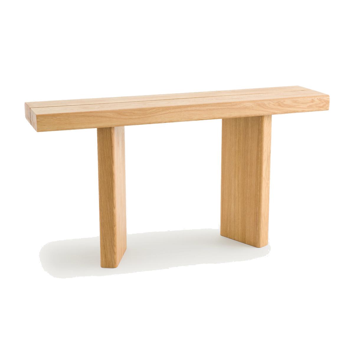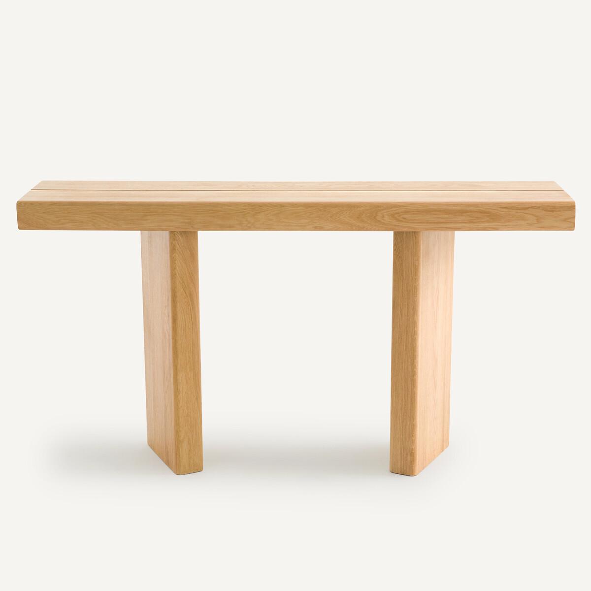 With a thick top and a massive structure, the Olaga console has a strong creative style. Its original base and balanced design make it an authentic and elegant piece of furniture. Product Details • Top and base in solid oak, polyurethane finish • Underside of the top in oak veneered MDF • FSC® certified wood. Dimensions • Width 140cm • H75cm • Depth 33cmDelivery:. Assembly required. Available for home delivery. • WOOD FROM SUSTAINABLY MANAGED FORESTS. FSC® certified wood comes from forests that are environmentally, socially and economically well managed. Dimensions and weight of parcel1 parcel • L152 x H23 x D44cm, 33kg