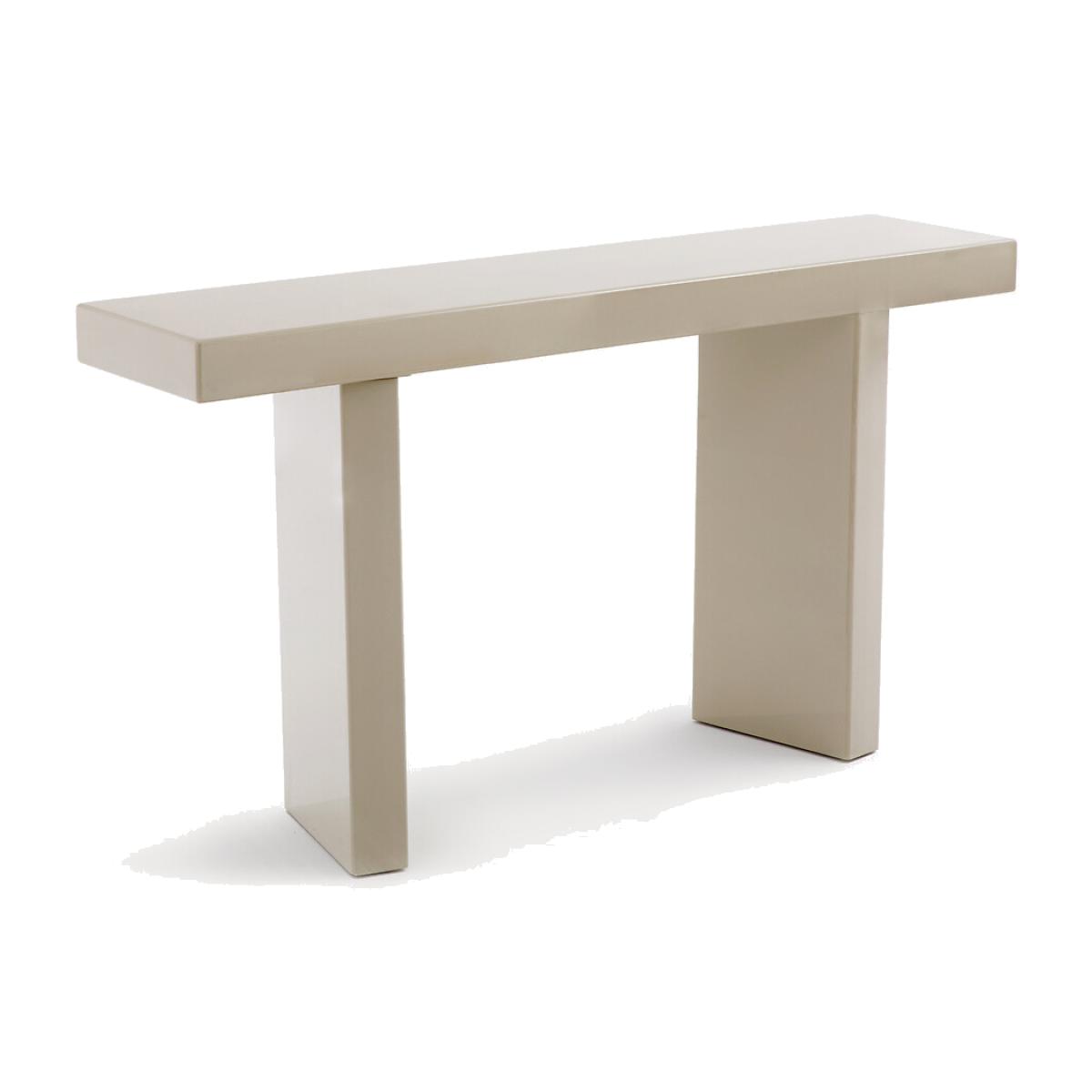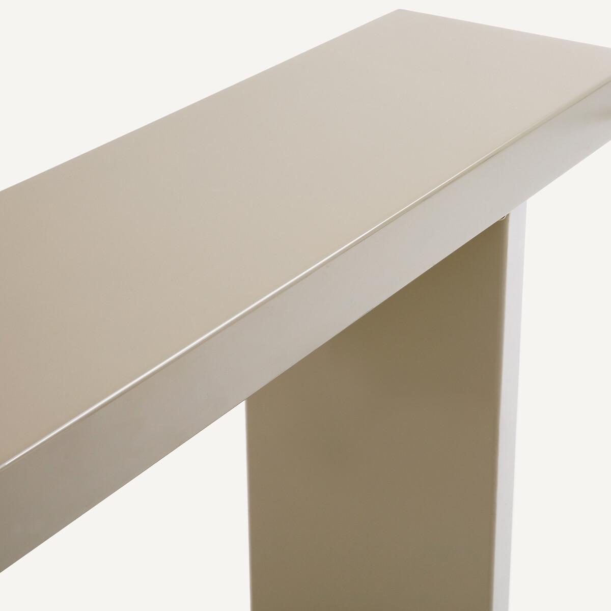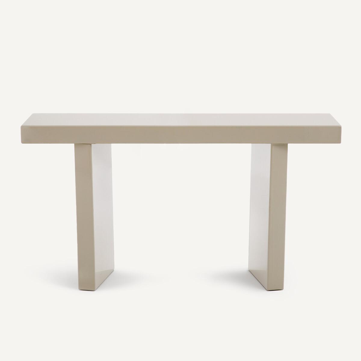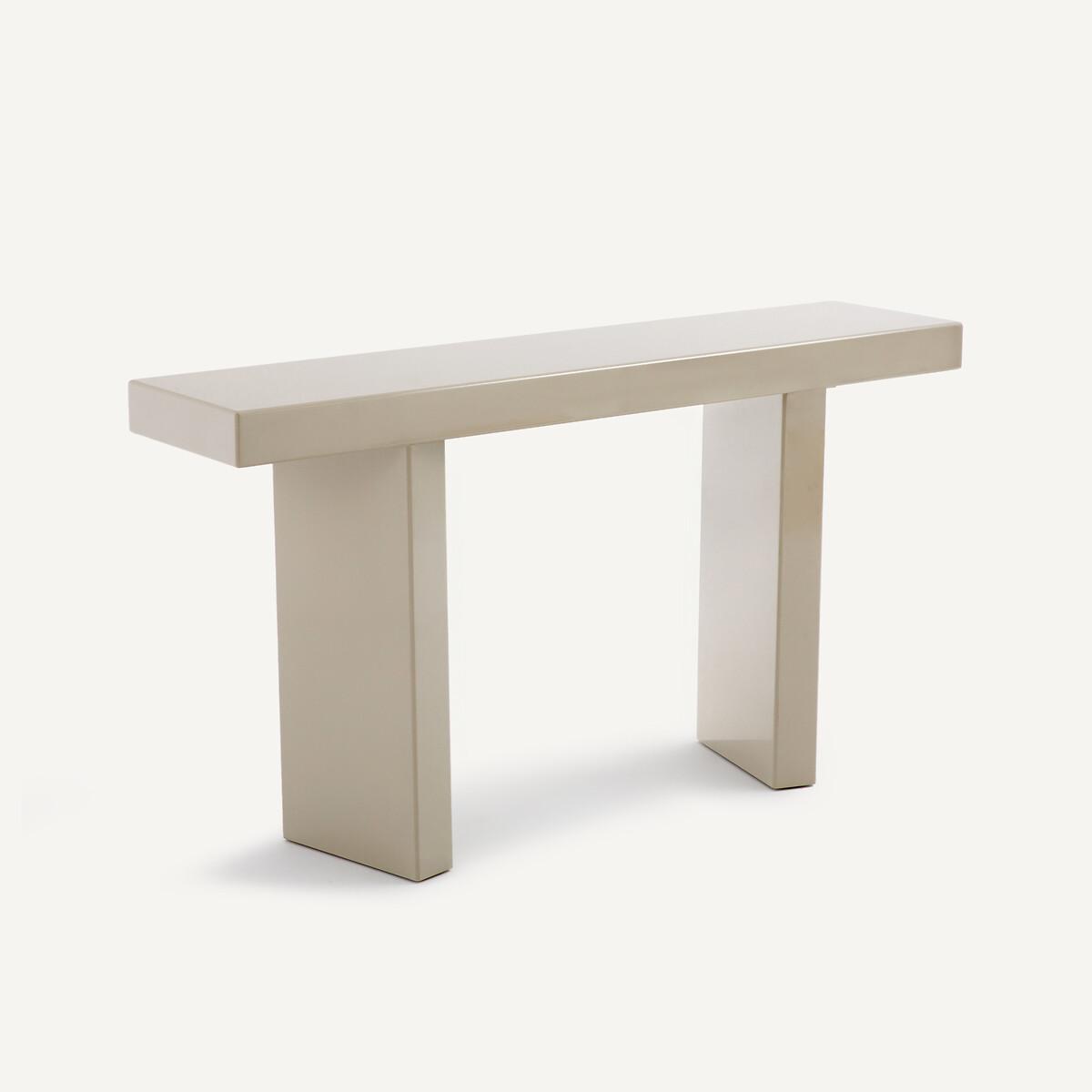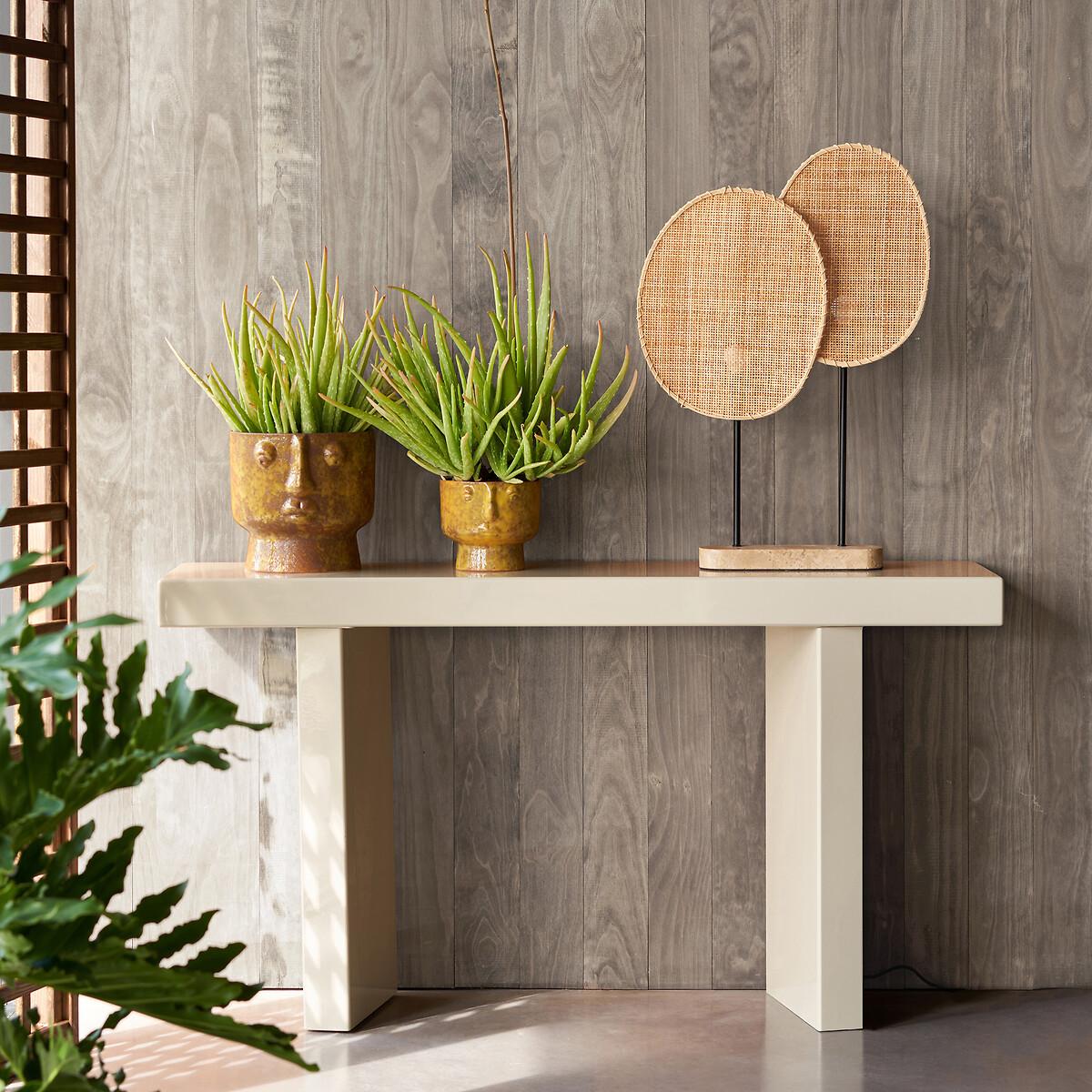 With its thick top, solid structure and high-gloss lacquer finish, the Olaga console table has a strong identity. Its original base and balanced design make it an authentic and elegant piece of furniture. Product Details • Top and legs in painted FSC® MDF • Glossy lacquer finish with polyurethane varnish Quality Info • Lacquer is a refined finish that enhances a piece of furniture. Its smooth and shiny finish reflects the light. A very special effect that catches the eye in a room. Based on polyurethane varnish, the lacquered surface is sensitive to scratches, humidity and heat. • To preserve their beauty, keep your lacquered furniture away from any heat source or a window exposed to the sun. Care Advice • Clean with a cloth dampened with a mild detergent.. Finish by wiping with a dry cloth. • Wipe up any spills immediately with a soft cloth. • Ban scratching sponges. • Do not place vases, plants or hot objects directly on the surface.. • We recommend the use of coasters and placemats. Dimensions • Width: 140cm • Height: 75cm • Depth: 33cm • Assembly required. • WOOD FROM SUSTAINABLY MANAGED FORESTS. FSC® certified wood comes from forests that are environmentally, socially and economically well managed. Dimensions and weight of parcel1 parcel L151 x H46 x D42cm, 25kg
