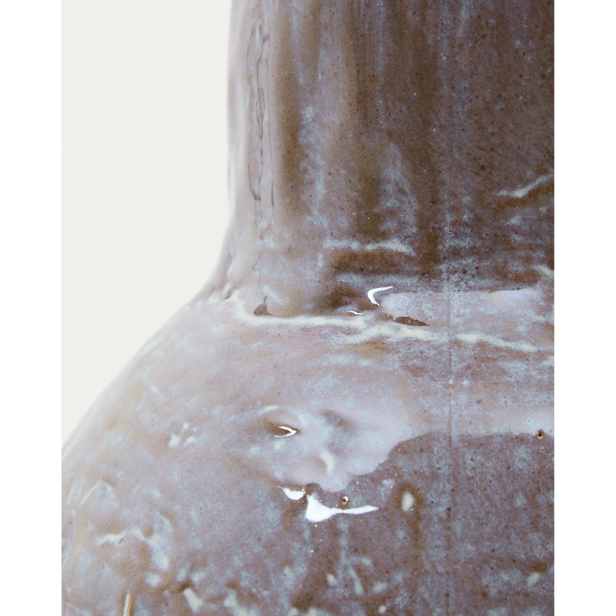 This is a ceramic vase that catches the eye with its vibrant design and contrasting colour scheme. Its traditional shape, with a round base and elongated neck, is complemented by a glazed finish divided into vertical stripes. The bright and well-defined shades stand out, providing dynamism and personality. It is an ideal decorative piece for those looking to add a bold, colourful touch of style to their space.