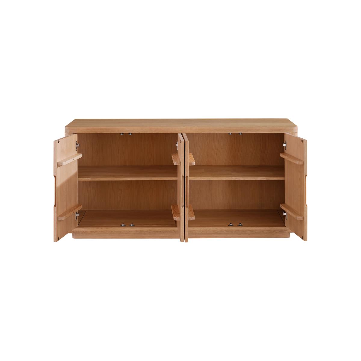 The Olav Neutral Wood 4 Door Sideboard offers a harmonious blend of stunning aesthetics and practical utility. Carefully crafted with precision, this sideboard showcases a robustnbsp;solid woodnbsp;frame with an oak veneered back panel. Its enchanting silhouette draws inspiration from French design, characterised by graceful curves, further enhanced by a luxurious water-based oil finish that accentuates the inherent beauty of the wood grain. Featuring fournbsp;cupboard doors, it provides generous handy storage space while infusing timeless elegance into any space.