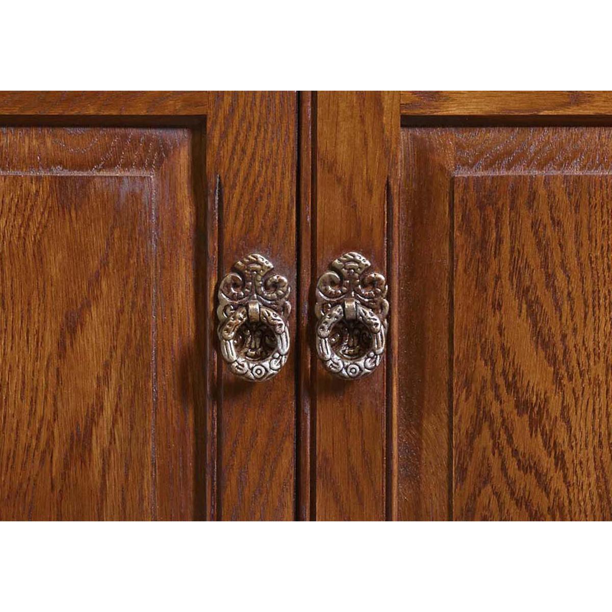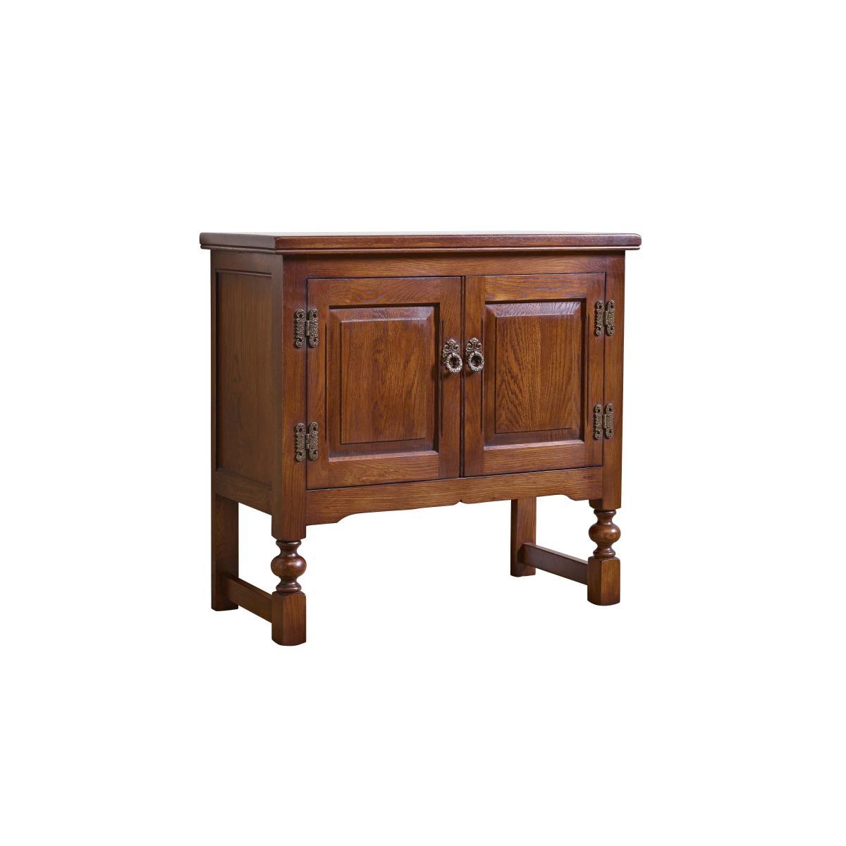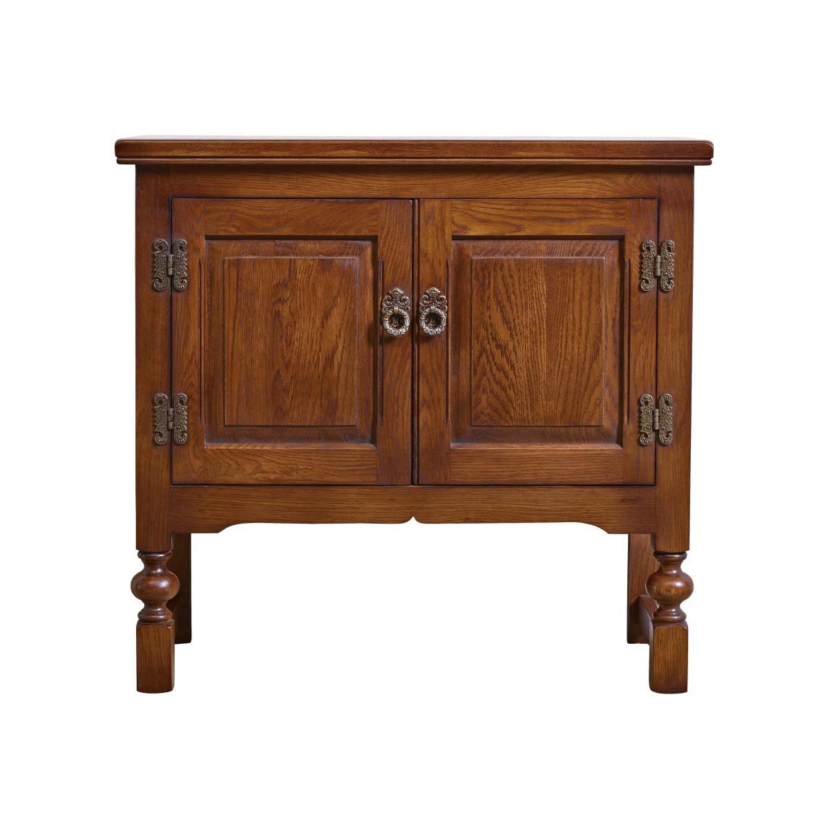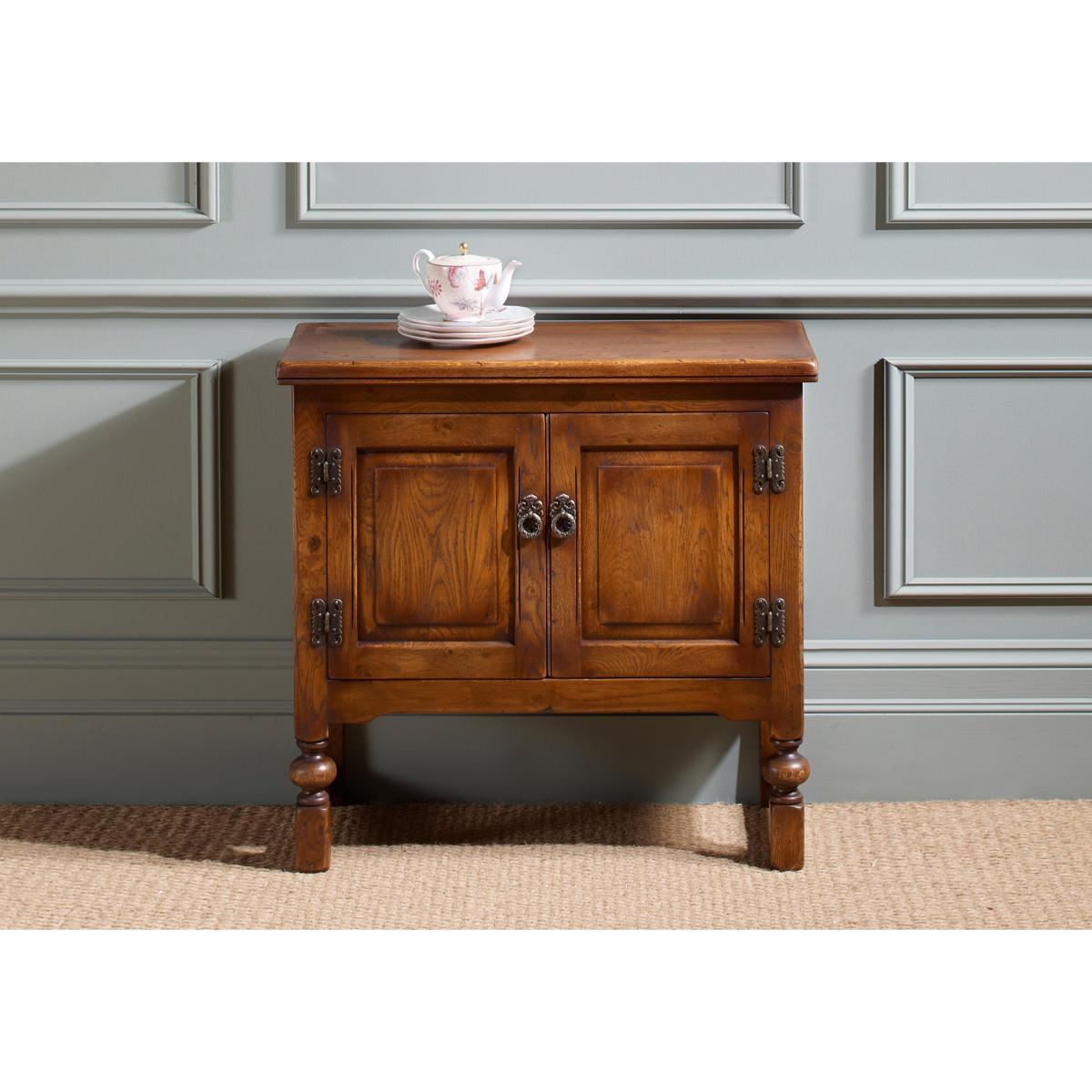 Traditional in style, authentic in character, and a beautiful choice for any style of home, the Old Charm collection of living room occasional and storage pieces and dining room tables and chairs draws inspiration from England’s golden years of furniture design and cabinet making. Using only the finest quality materials, Old Charm pieces showcase turned legs, carved embellishments, secret storage compartments and metal hardware. Classic in style and wonderfully well-crafted, Old Charm makes a return to the living and dining rooms of a bygone era an effortless pleasure. Made in England. Exquisitely crafted oak double pedestal cabinet from Old Charm. Made of characterful oak and oak veneers. With a solid oak top and turned legs. Spacious double cupboard with single adjustable internal shelf. Cupboard doors are panelled. Decorative metal hinges and handles. A British-designed classic.