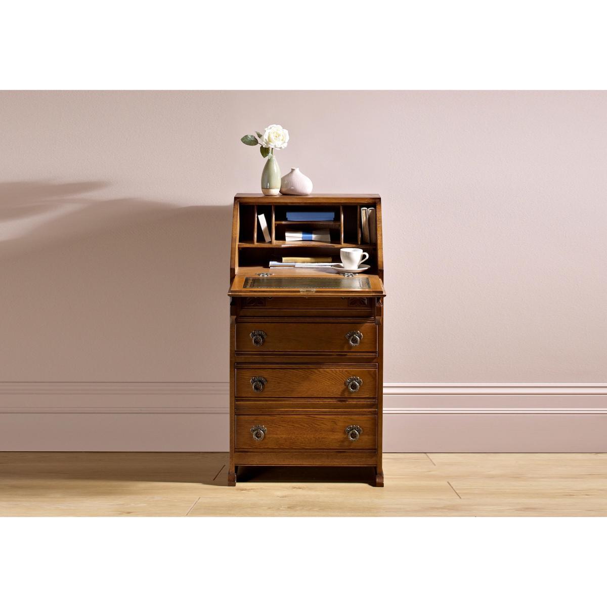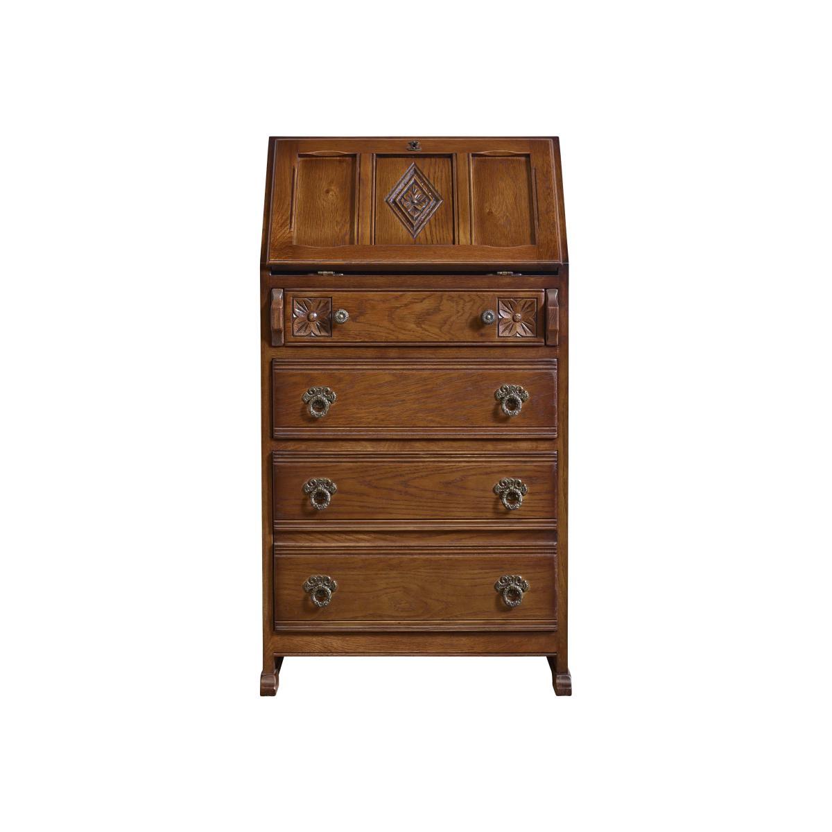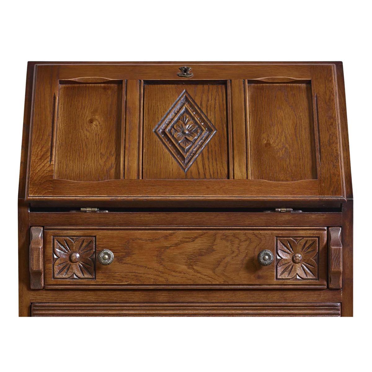 Traditional in style, authentic in character, and a beautiful choice for any style of home, the Old Charm collection of living room occasional and storage pieces and dining room tables and chairs draws inspiration from England’s golden years of furniture design and cabinet making. Using only the finest quality materials, Old Charm pieces showcase turned legs, carved embellishments, secret storage compartments and metal hardware. Classic in style and wonderfully well-crafted, Old Charm makes a return to the living and dining rooms of a bygone era an effortless pleasure. Made in England. Exquisitely crafted oak ladies bureau from Old Charm. Made of characterful oak, a British-designed classic. Lockable fold out writing desk. Desk has shelves, cable management and stationary compartments. Leather desk writing surface in a choice of red, green or pewter. Front drop flap has a stylised diamond carving with flower motif. Two spacious drawers below with decorative metal ring handles. Bottom two drawers are a false front for a large filing drawer. WARNING!. Furniture can tip over unexpectedly and cause injury. This item shall be fixed to a wall using the anti-tip kit provided with the furniture. Be sure to use the correct wall fixings suitable for the walls in your home.