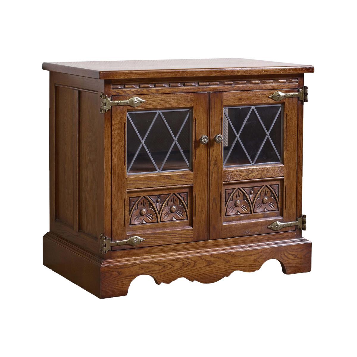 Traditional in style, authentic in character, and a beautiful choice for any style of home, the Old Charm collection of living room occasional and storage pieces and dining room tables and chairs draws inspiration from England’s golden years of furniture design and cabinet making. Using only the finest quality materials, Old Charm pieces showcase turned legs, carved embellishments, secret storage compartments and metal hardware. Classic in style and wonderfully well-crafted, Old Charm makes a return to the living and dining rooms of a bygone era an effortless pleasure. Made in England. Compact and characterful, this lovely video and media storage cabinet from Old Charm showcases beautiful details including hand-carved cactus flowers and leaded glass doors. Why you'll love it. Traditional-style oak video cabinet displays a wealth of wonderful detail. Inspired by Tudor and Elizabethan craftsmanship. Made from the finest characterful oak. Generous storage for all your media equipment. Cupboard has leaded glass doors and hand-carved cactus flower panels. Remote controls work even when doors are closed. Cable management system at the cupboard back. Bespoke metal door pulls. Decorative plinth-style base. Designed with care in Britain. What you need to know. Cupboard has 2 fixed shelves. As oak is a natural material, you can expect to see knots, markings and colour variations. Part of the Old Charm collection of living room and dining room furniture.