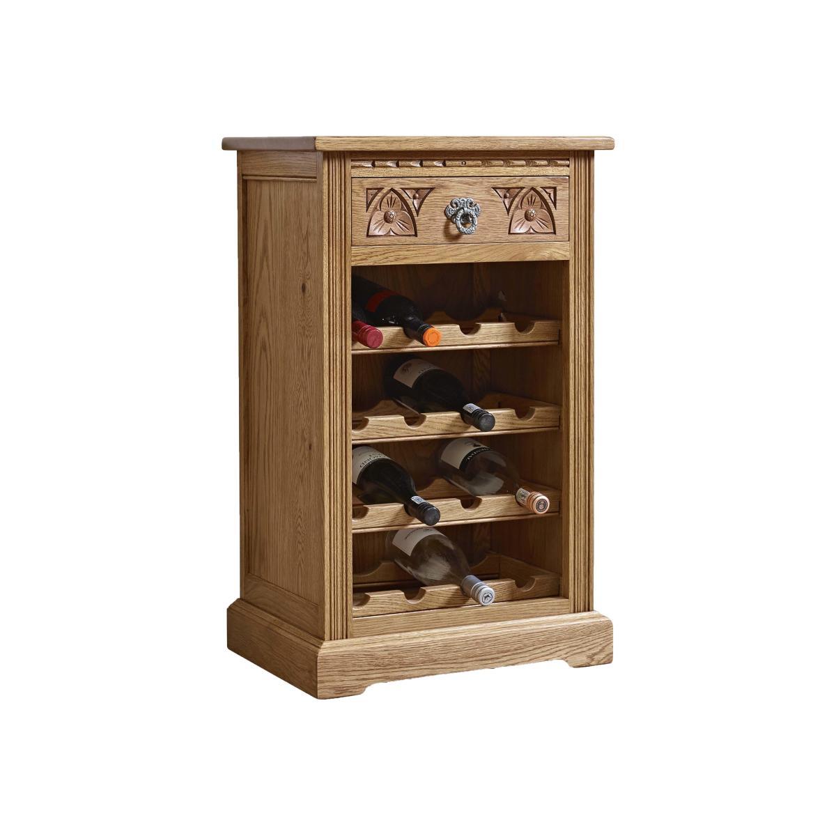 Traditional in style, authentic in character, and a beautiful choice for any style of home, the Old Charm collection of living room occasional and storage pieces and dining room tables and chairs draws inspiration from England’s golden years of furniture design and cabinet making. Using only the finest quality materials, Old Charm pieces showcase turned legs, carved embellishments, secret storage compartments and metal hardware. Classic in style and wonderfully well-crafted, Old Charm makes a return to the living and dining rooms of a bygone era an effortless pleasure. Made in England. Eminently functional, this sturdy wine cabinet is also a lovely decorative piece of furniture, showcasing traditional details and wonderful craftsmanship. Perfect for a kitchen or dining room. Why you'll love it. Traditional-style oak wine rack displays a wealth of wonderful detail. Inspired by Tudor and Elizabethan craftsmanship. Made from the finest characterful oak. Useful drawer and space for 16 wine bottles. Hand-finished cactus flower and chop carvings. Bespoke metal drawer pull. Simple plinth-style base. Designed with care in Britain. What you need to know. As oak is a natural material, you can expect to see knots, markings and colour variations. Part of the Old Charm collection of living room and dining room furniture.