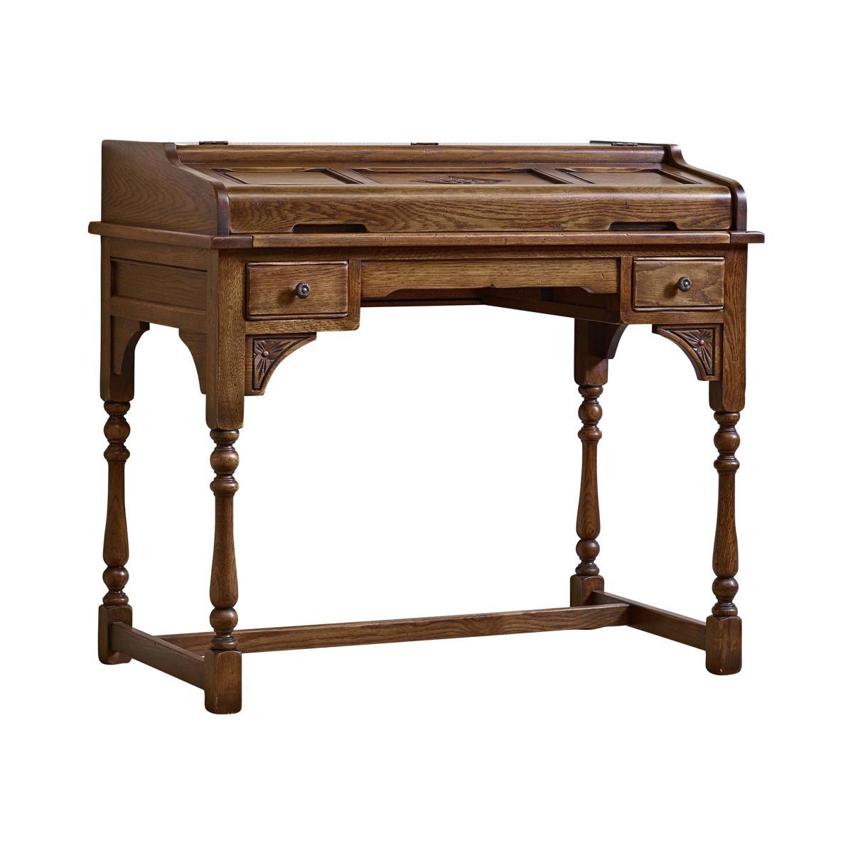 Traditional in style, authentic in character, and a beautiful choice for any style of home, the Old Charm collection of living room occasional and storage pieces and dining room tables and chairs draws inspiration from England’s golden years of furniture design and cabinet making. Using only the finest quality materials, Old Charm pieces showcase turned legs, carved embellishments, secret storage compartments and metal hardware. Classic in style and wonderfully well-crafted, Old Charm makes a return to the living and dining rooms of a bygone era an effortless pleasure. Made in England. This elegant and practical traditional writing desk has a useful arrangement of drawers and shelves as well as a sturdy writing surface and hidden secret tray for valuables. Why you'll love it. Traditional oak writing desk displays a wealth of wonderful detail. Inspired by Tudor and Elizabethan design and craftsmanship. Made from the finest characterful oak. Lift-up top reveals miniature drawers and shelving. With 2 larger lower drawers and slender hidden tray. Hand-finished carvings include cactus flowers and lid-top diamond. Bespoke metal drawer pulls. Turned legs and sturdy H-frame base. Designed with care in Britain. What you need to know. As oak is a natural material, you can expect to see knots, markings and colour variations. Part of the Old Charm collection of living room and dining room furniture.