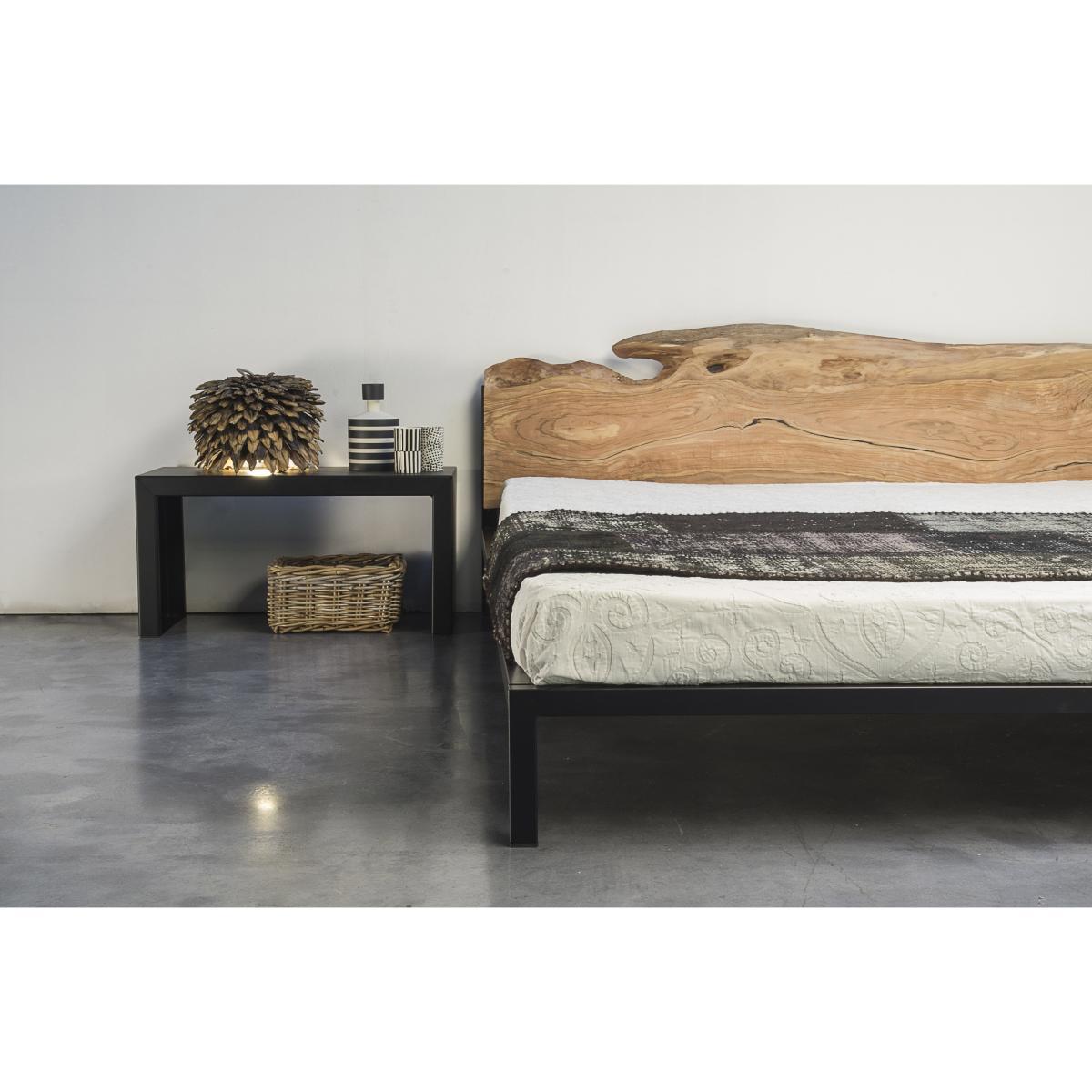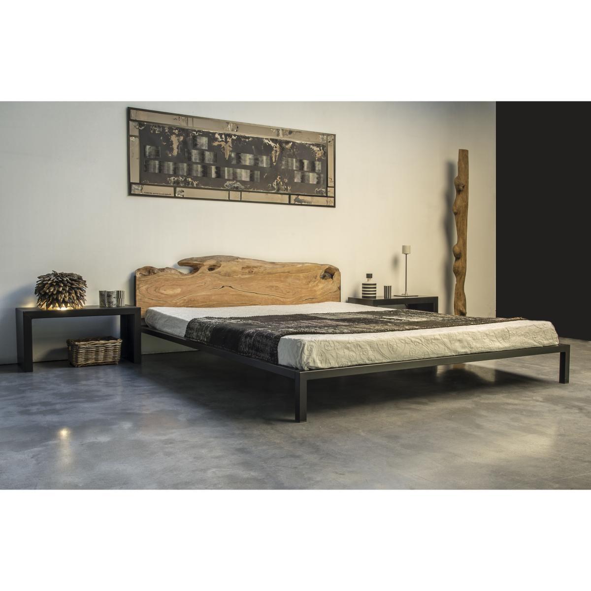 A natural feel and raw beauty for this fantastic bed that has the air of a primitive sculpture! The charisma of the Old Times bed is expressed through a mix of simplicity, modernity and authenticity. Each headboard is an extraordinary, unique piece, hand-crafted from a single piece of old wood (olive) which is then waxed. Just two Italian cabinetmakers work on making the Old Times collection, which requires exceptional craftsmanship. Old Times showcases wood in its raw state: the defects which are generally glossed over here are highlighted and shown off. The knots and irregular contours of the headboard are the ingredients of a primitive aesthetic that draws a link between present and past. This bed tells us about those ancient times when men sat on tree trunks and rocks. The minimalist design of the copper black-painted steel structure superbly sets off the headboard. This bed comes with a perforated frame in beech plywood. It is suitable for a mattress 160 x 210 cm (mattress not supplied). PLEASE NOTE: NON-CONTRACTUAL IMAGE. Each wooden headboard is a unique piece that will not necessarily be identical to the one shown in the photo.