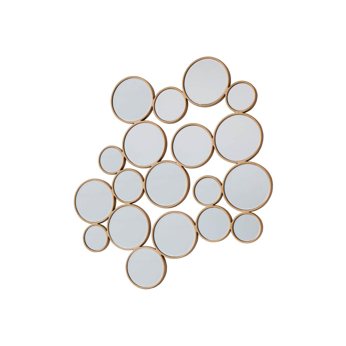A statement contemporary round mirror design surrounded by a soft gold protruding frame. Shape: Irregular. Material: Glass, MDF. Colour/Finish: Gold. Mount Type: Wall.