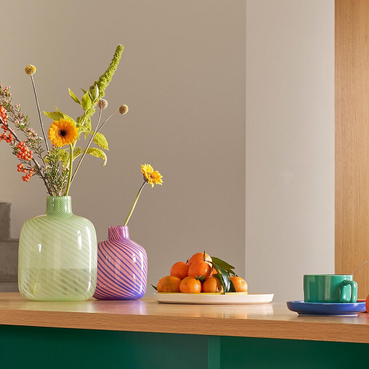I love this vase for its clean, modern look and versatile design. The striped glass adds a subtle touch of colour and visual interest without overwhelming a space. It works particularly well in contemporary or minimalist interiors, but its understated style can also complement more eclectic schemes. Practical styling tips include pairing it with simple, single-stem flowers or greenery to highlight the pattern, or using it as a standalone decorative piece on a shelf or side table. Its H22.5cm height makes it perfect for placing on mantels, sideboards, or as a centrepiece on dining tables to add a touch of colour and texture.