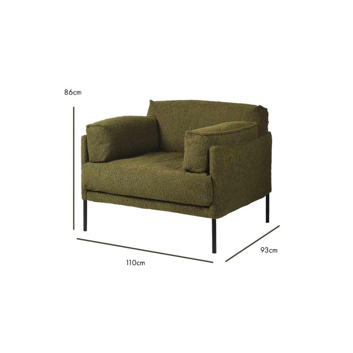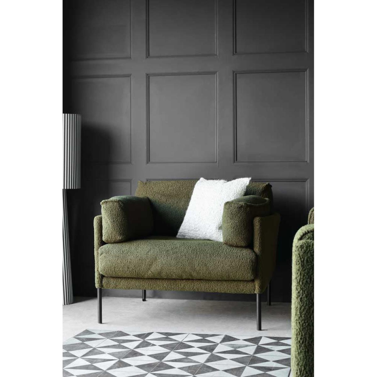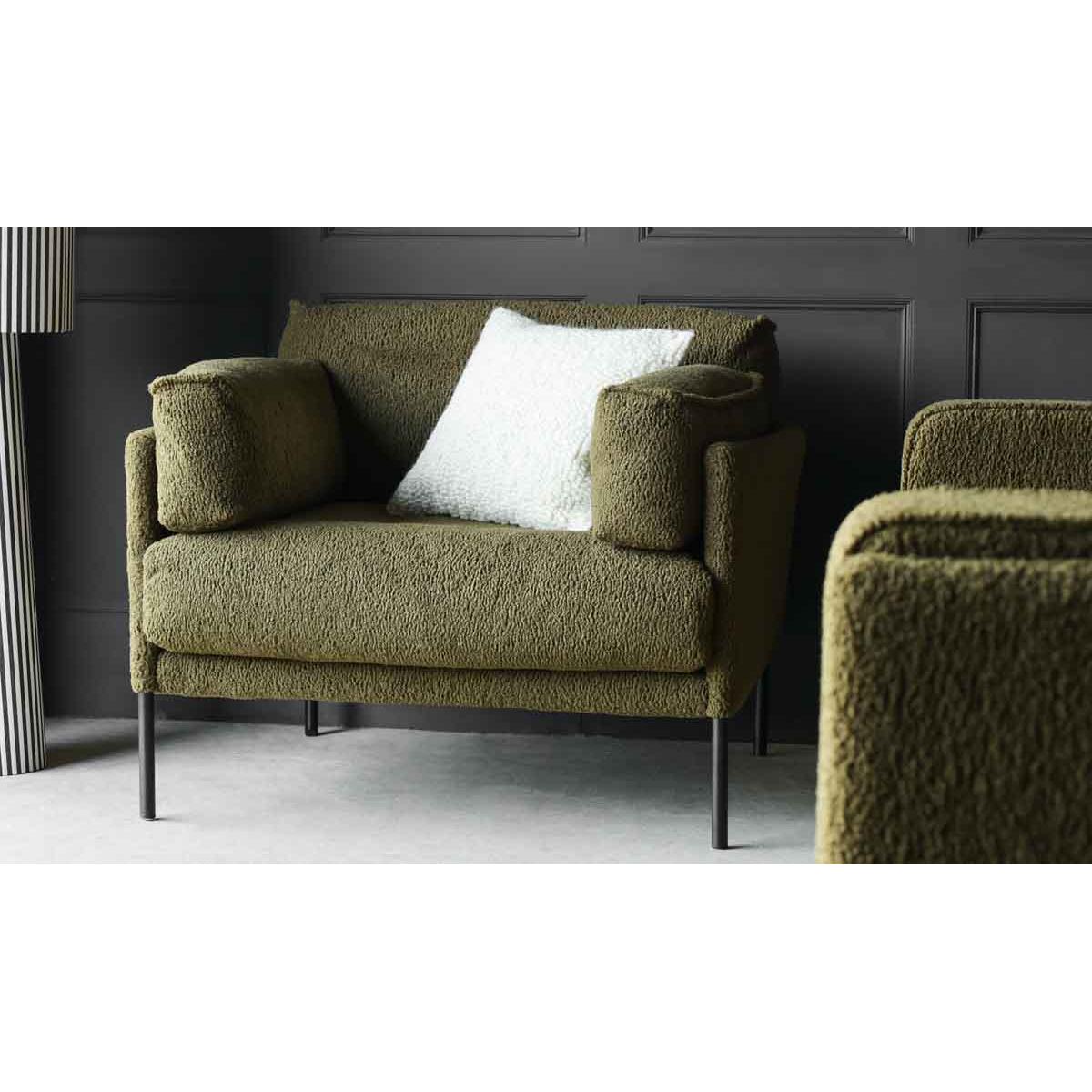 About The Olive Chunky Boucle Armchair Chic and cosy, the Olive Chunky Boucle Armchair is destined to become your new favourite spot in the house to sit back and relax in style. Designed with a fabulous olive-green colour palette, the bold chunky texture of the boucle upholstery is paired with a modern box frame and matt black chair legs. Measuring H86cm x W110cm x D93cm, the boucle armchair also includes two side cushions as stylish armrests. Why We Think You’ll Love The Olive Green ArmchairBoucle is one of our favourite upholstery options of the moment and the chunky style of this luxe lounge chair helps to take the boucle trend to the next level. From the gorgeous olive-green colour palette to the modern silhouette, this is statement seating at its finest. In addition, the wide shape helps ensure a cosy spot for curling up with a cup of tea and a magazine during the day, or a glass of wine and the latest series at night. How To Style The Green Boucle ChairGreen is one of the easiest colours to style in your home as it goes with just about everything. So, whether your living room embraces a dark and decadent colour palette or has been decorated with modern neutrals, the Olive Chunky Boucle Armchair will blend in beautifully. To complete the look, why not pair the boucle chair with the matching Olive Chunky Boucle Sofa?!