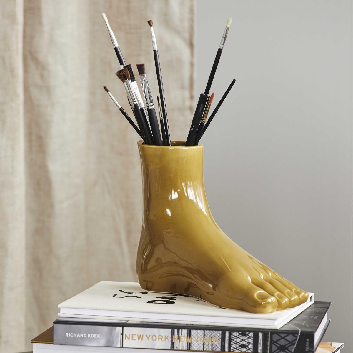 A sculptural vase in the shape of a foot and in an unusual olive tone of yellow, fill with your own painter's brushes or an unusual posy of flowers for an artistic addition to your home.