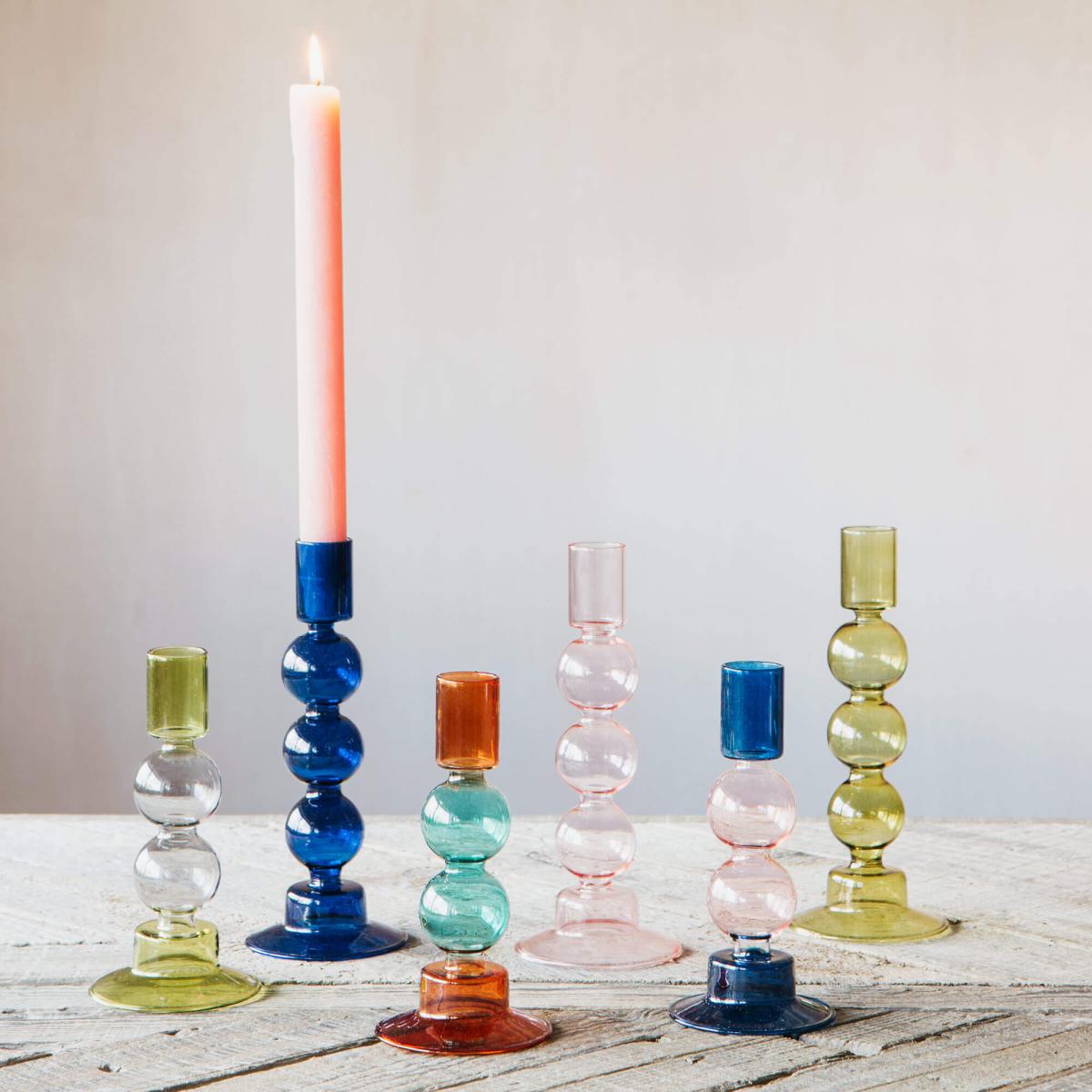 Perfect for holding rainbow coloured dining candles, this abstract glass candle holder features a curvy bubble silhouette and a pretty coloured tint in one or two tones. Mix and match for a colourful candle collection.