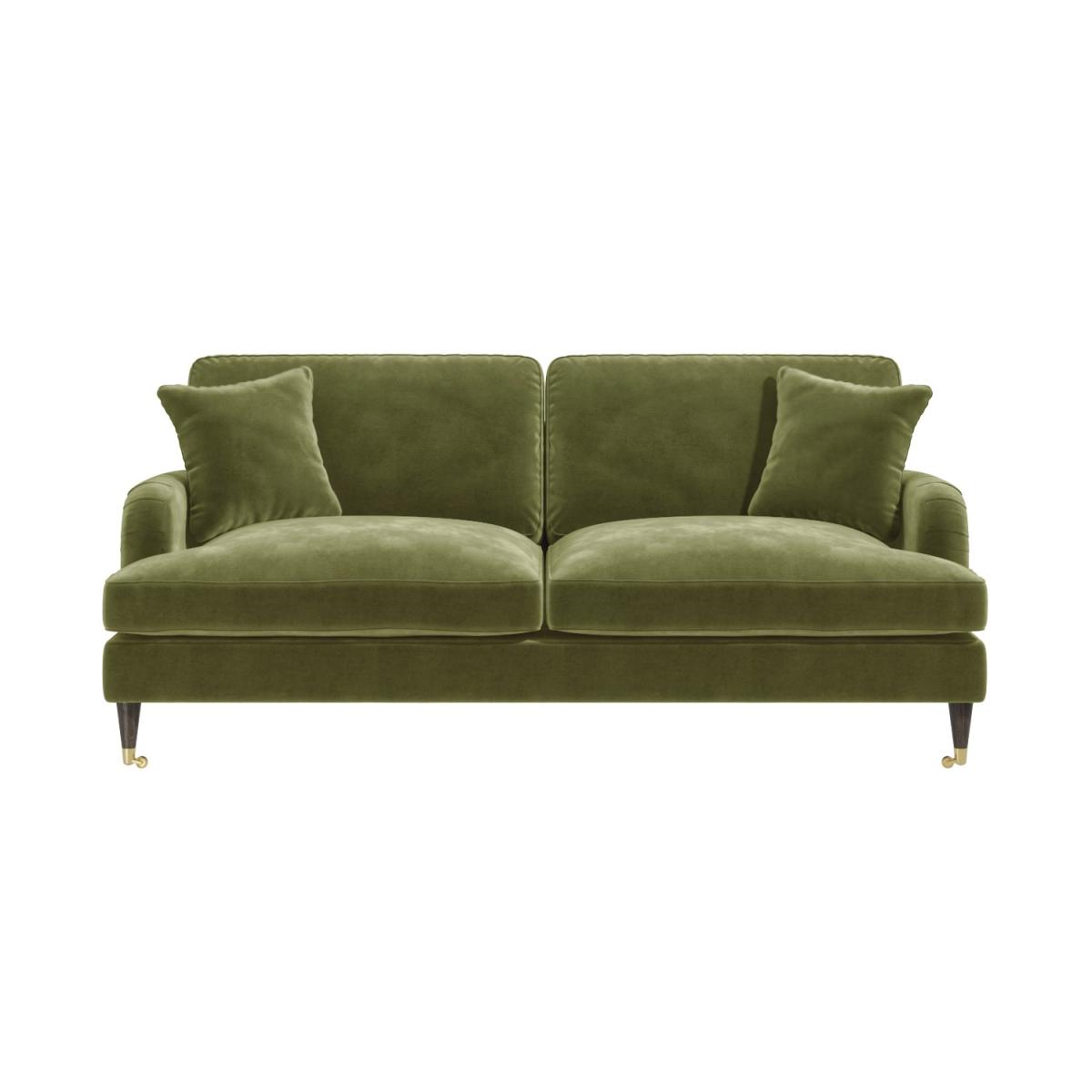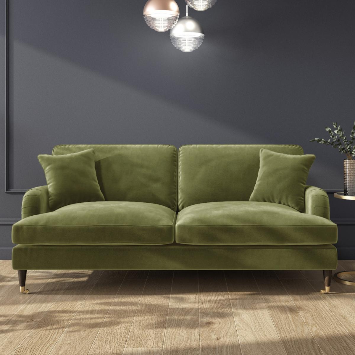 Discover maximum comfort and minimum maintenance with this gorgeous sofa. This soft velvet three-seater sofa offers traditional styling with a modern twist thanks to its dark wooden legs with gold accent front castors and classic ruched saddle arms. Beautifully tailored and upholstered in olive green velvet, it brings a splash of colour to your living space, making it the perfect statement piece. It comfortably seats three and comes accompanied with two matching throw cushions which add a final flourish of elegance. Adding this trend-setting piece to your home is easy. There's minimum assembly; it's just a case of fixing the legs into position.