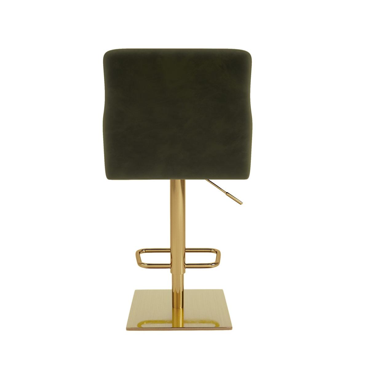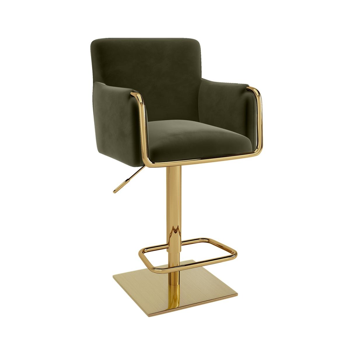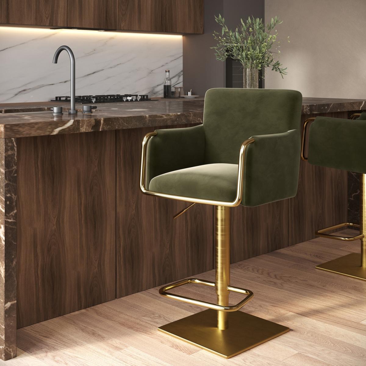 Upholstered in soft and smooth olive green velvet, offering a plush, sophisticated look that enhances any space. Effortlessly customise the stool's height to suit your needs with an easy-to-use lever, making it ideal for various counter or bar heights. 360-degree swivel functionality allows for seamless movement and flexibility, perfect for entertaining or casual use. The brushed gold base not only adds a touch of glamour but ensures exceptional stability and durability. Designed with an extra-large seat and supportive backrest, offering supreme comfort for extended periods of seating. Elevate your home bar or kitchen island with the Sonny Adjustable Barstool. Upholstered in olive green velvet, it exudes a refined elegance that pairs beautifully with the brushed gold base. Designed for both style and functionality, this barstool features an adjustable height mechanism, allowing you to tailor it perfectly to your setup. Its 360-degree swivel function offers ease of movement, while the extra-large seat and supportive backrest ensure comfort during extended use. Whether you’re entertaining guests or enjoying a quiet moment, the Sonny Barstool is the perfect combination of luxury and practicality.