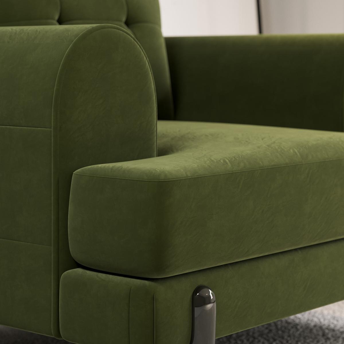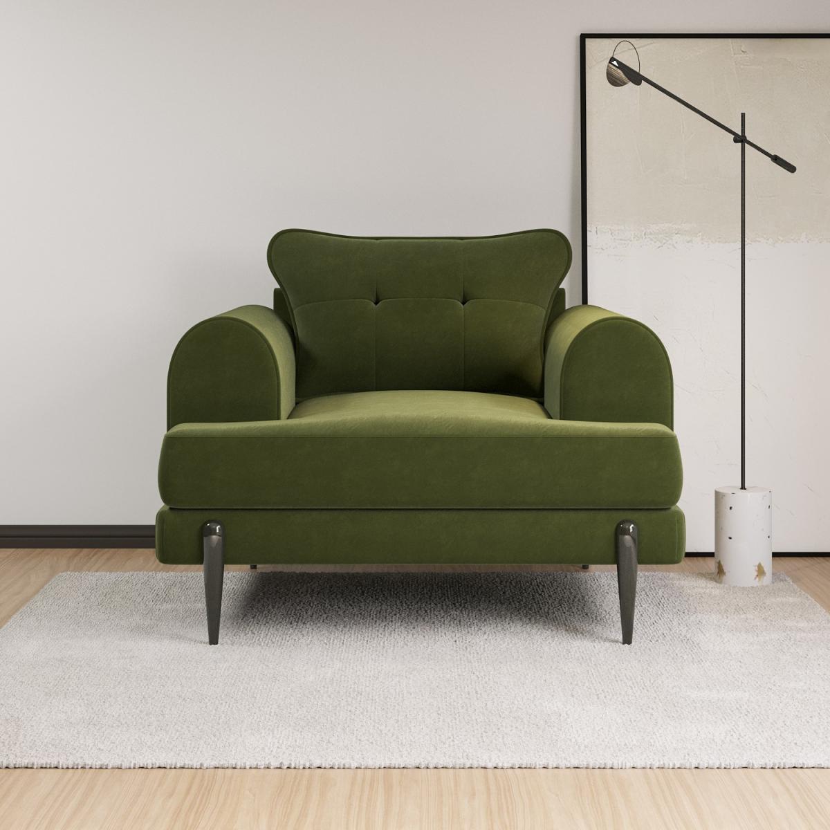 All about me. The Rosie armchair creates a statement in any living room with a quilted back detail and olive green velvet upholstery that adds a pop of colour to any interior style. Pair with the matching Rosie furniture for the perfect look. Need to know. Dimensions. W98 x D92 x H85 cm Packaging dimensions. W100 x D94 x H57 cm Weight. 30 kg Maximum supported weight. 110 kg per seat Colour. Olive green black legs Finish. Upholstered Material. Velvet fabric metal legs Filling. Foam Frame. Strong plywood and eucalyptus wood Assembly required. Yes - just attach the legs.