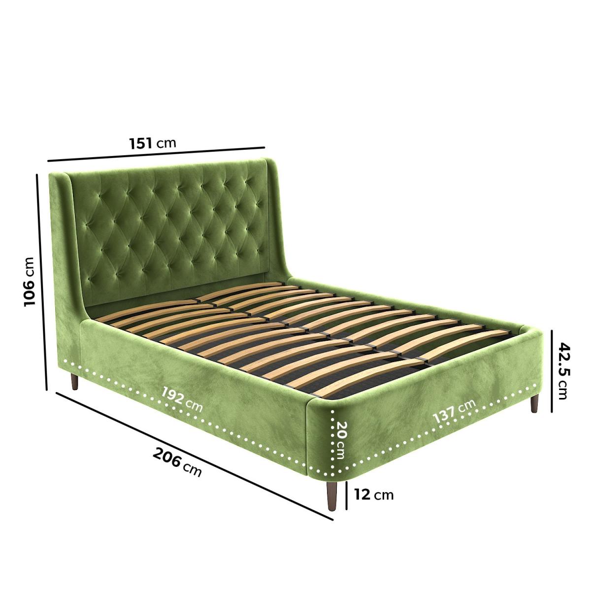 Features we love Elegant double bed with winged chesterfield headboard A mid-century design with tapered dark wood legs Upholstered in a luxurious plush olive green velvet Ottoman storage with a gas lift mechanism for easy access The sturdy base is sprung-slatted for ultimate comfort All about me The Amara double ottoman bed frame with winged chesterfield headboard provides plenty of storage space for your belongings. It features a sturdy sprung-slatted base that keeps your items protected and a gas-lift mechanism that ensures easy access to the space beneath. It's upholstered in an ultra-soft olive green velvet fabric that complements its mid-century styling and dark wood legs. The Amara ottoman bed is guaranteed to make a stunning focal point in any bedroom. Need to know Bed dimensions:W151 x D206 x H118 cm Storage dimensions: W137 x D192 x H20 cm Mattress size: Standard UK double (4ft6) Mattress included: No Finish: Upholstered Material: Velvet fabric Colour:Olive green Bed base: Sprung-slatted Weight: 63 kg Assembly required: Yes Packaging dimensions (3 boxes):W141 x D111 x H16 cm, W196 x D33 x H28 cm, W109 x D26 x H17 cm Please be advised the ottoman lift mechanism supports a weight of up to 55kg when open