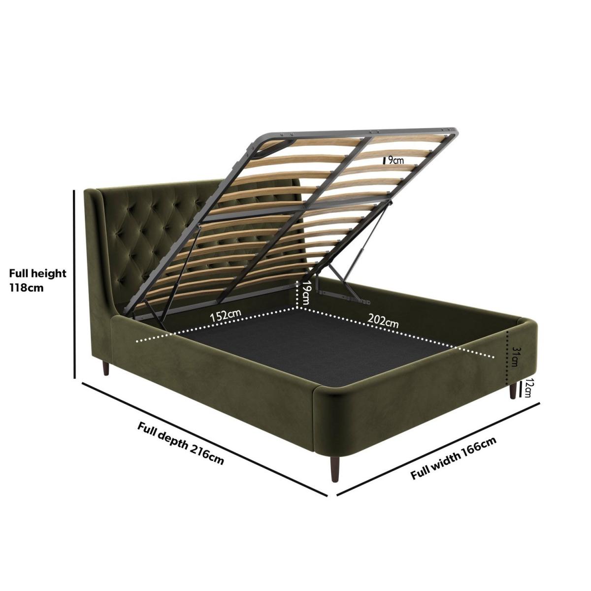 With its elegant winged Chesterfield headboard, Amara exudes timeless sophistication, combining classic deep-buttoned detailing with a plush, upholstered finish. Upholstered in a luxuriously soft olive green velvet, making it a statement piece in any bedroom, whilst blending beautifully with various interior styles. The lift-up base reveals a spacious storage compartment, perfect for keeping bedding, clothes, or other essentials neatly organised. Made with durable materials and a sturdy frame, this bed is designed to keep you comfy for years to come while looking effortlessly stylish in your space. Provides strong, stable support and keeps your stored items protected. The Amara ottoman bed is guaranteed to make a stunning focal point in any bedroom, with a winged Chesterfield headboard and plenty of storage for your belongings. It features a sturdy sprung-slatted base and a gas-lift mechanism that ensures easy access to the space beneath. The storage base is wooden to protect stored items from dust. Upholstered in ultra-soft olive green velvet, it perfectly complements the mid-century design, while the legs are crafted from beech wood with a dark finish for a natural, timeless touch.
