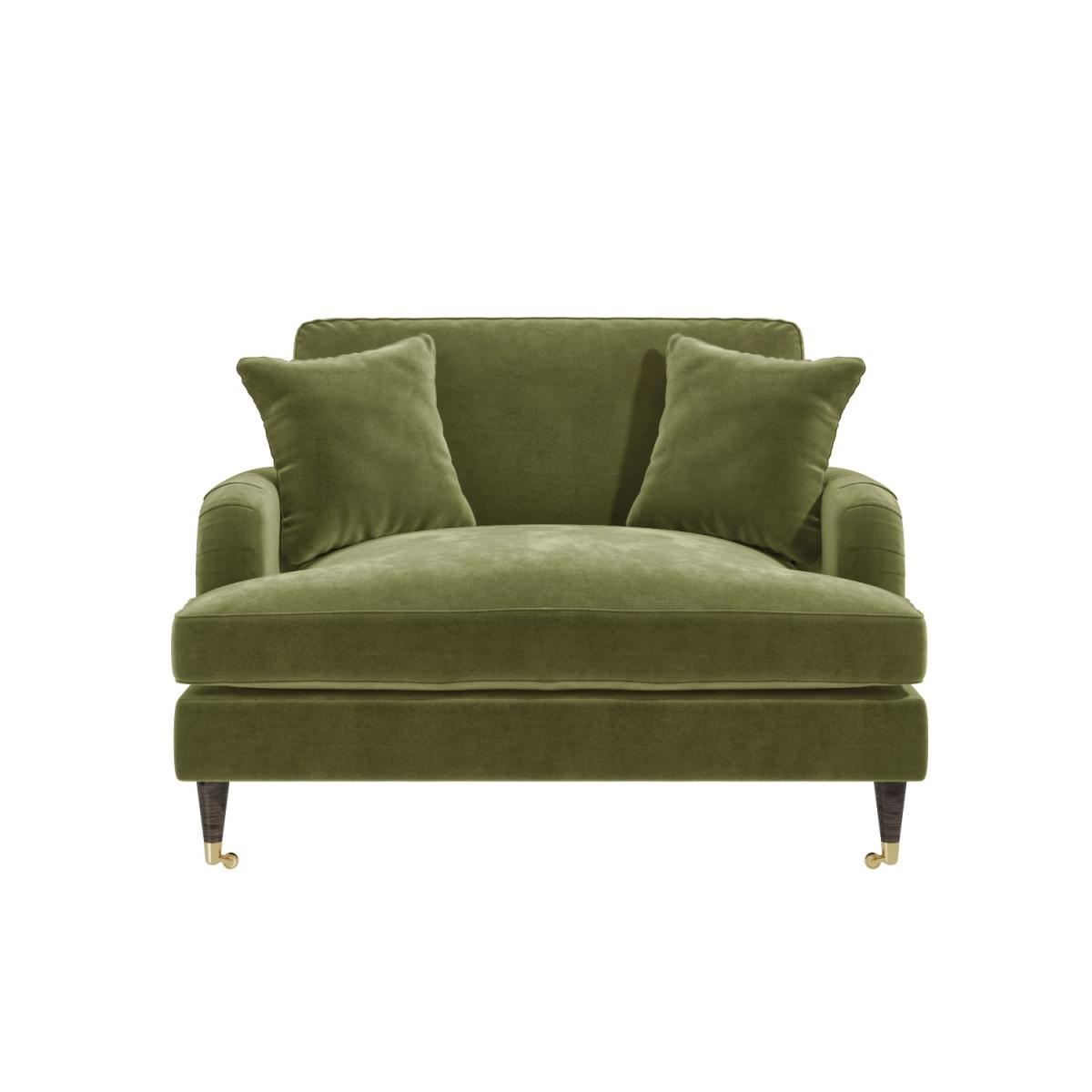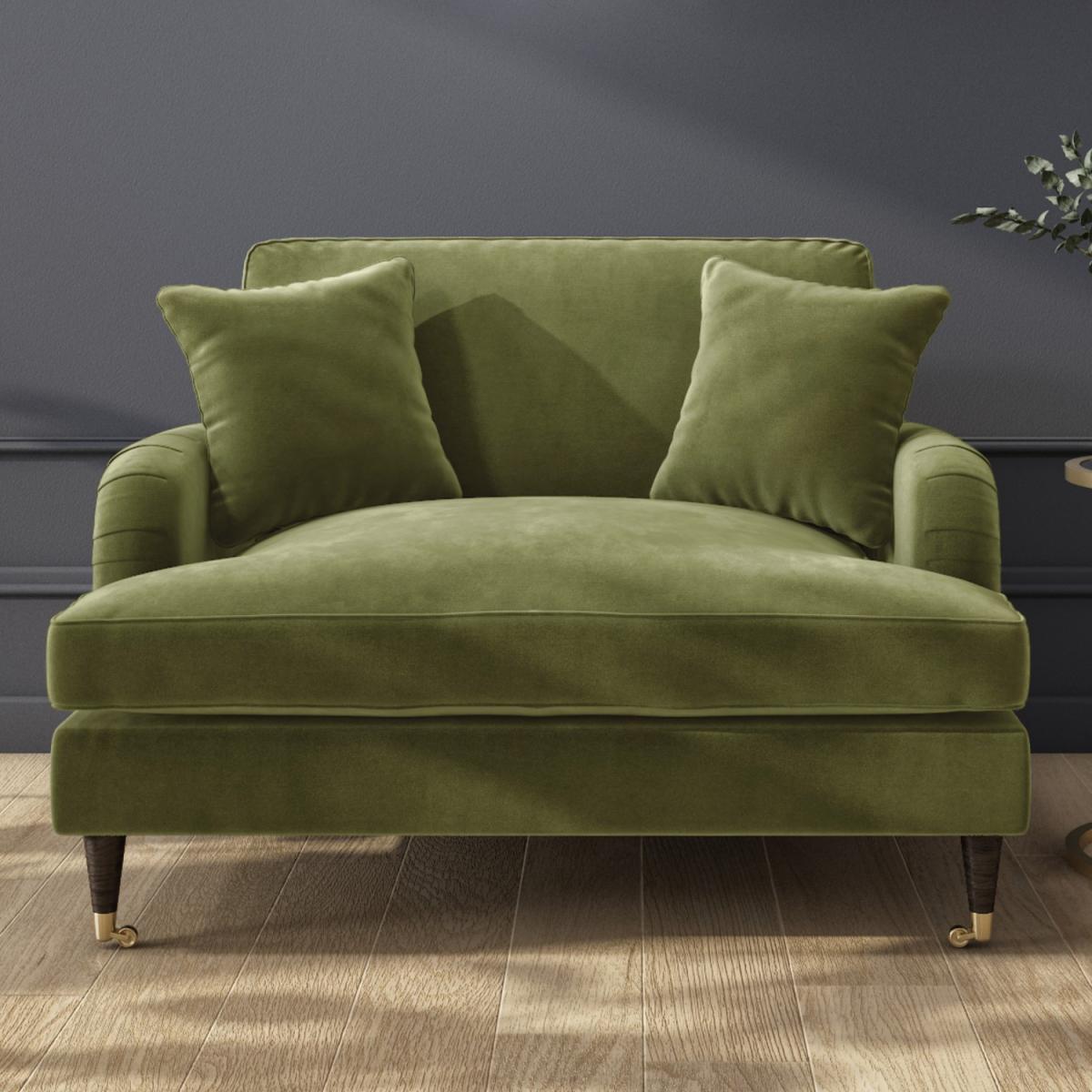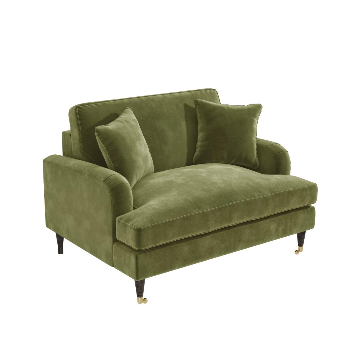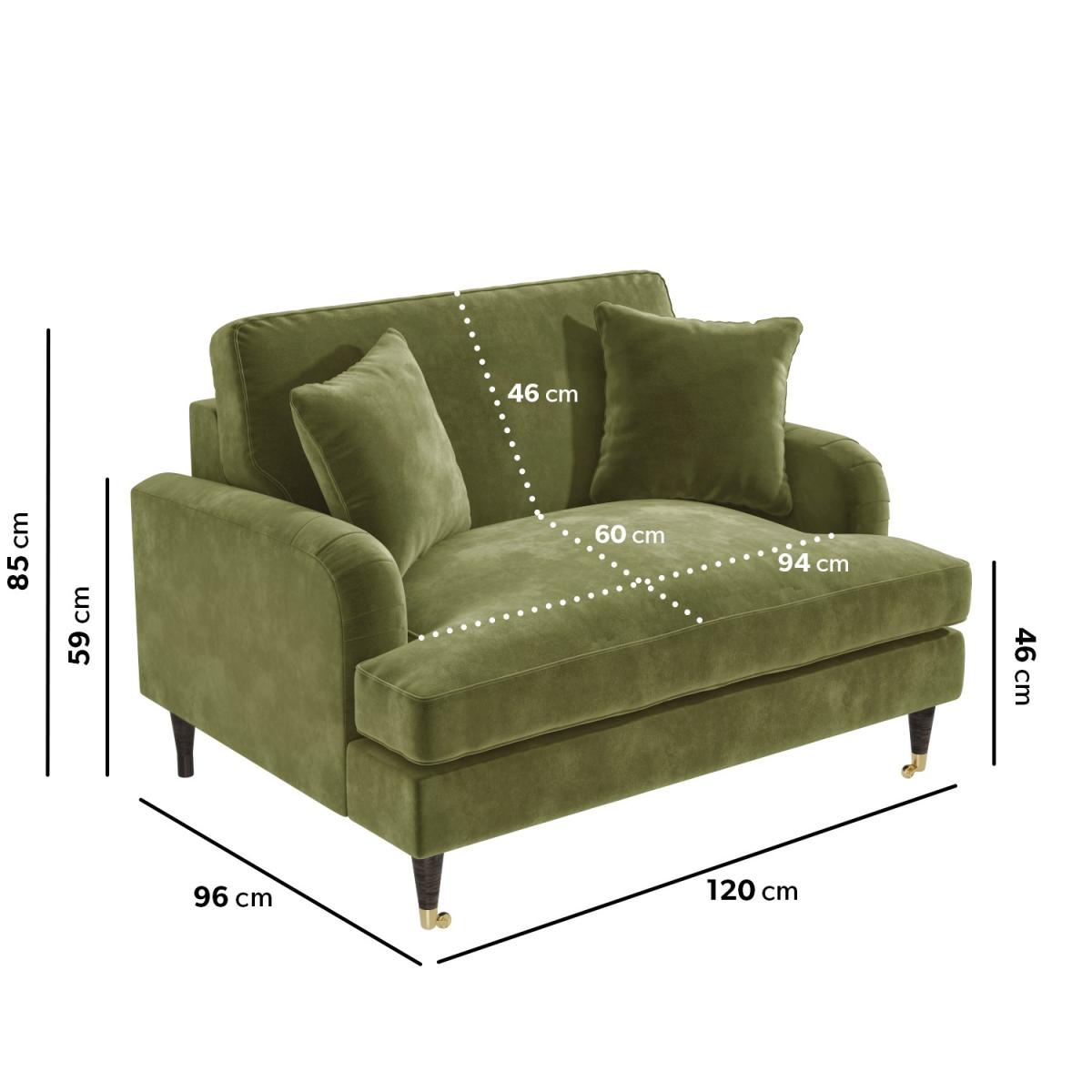 Discover maximum comfort and minimum maintenance with this gorgeous loveseat. This plush Payton Love seat offers traditional styling with a modern twist thanks to its dark wooden legs with gold accent front castors and classic ruched saddle arms. The love chair is beautifully tailored and upholstered in soft olive green velvet, it brings a splash of elegance to your living space, making it the perfect statement piece. It comfortably seats two and comes accompanied with two matching throw cushions for extra support. Adding this trend-setting piece to your home is easy. There's minimum assembly; it's just a case of fixing the legs into position.