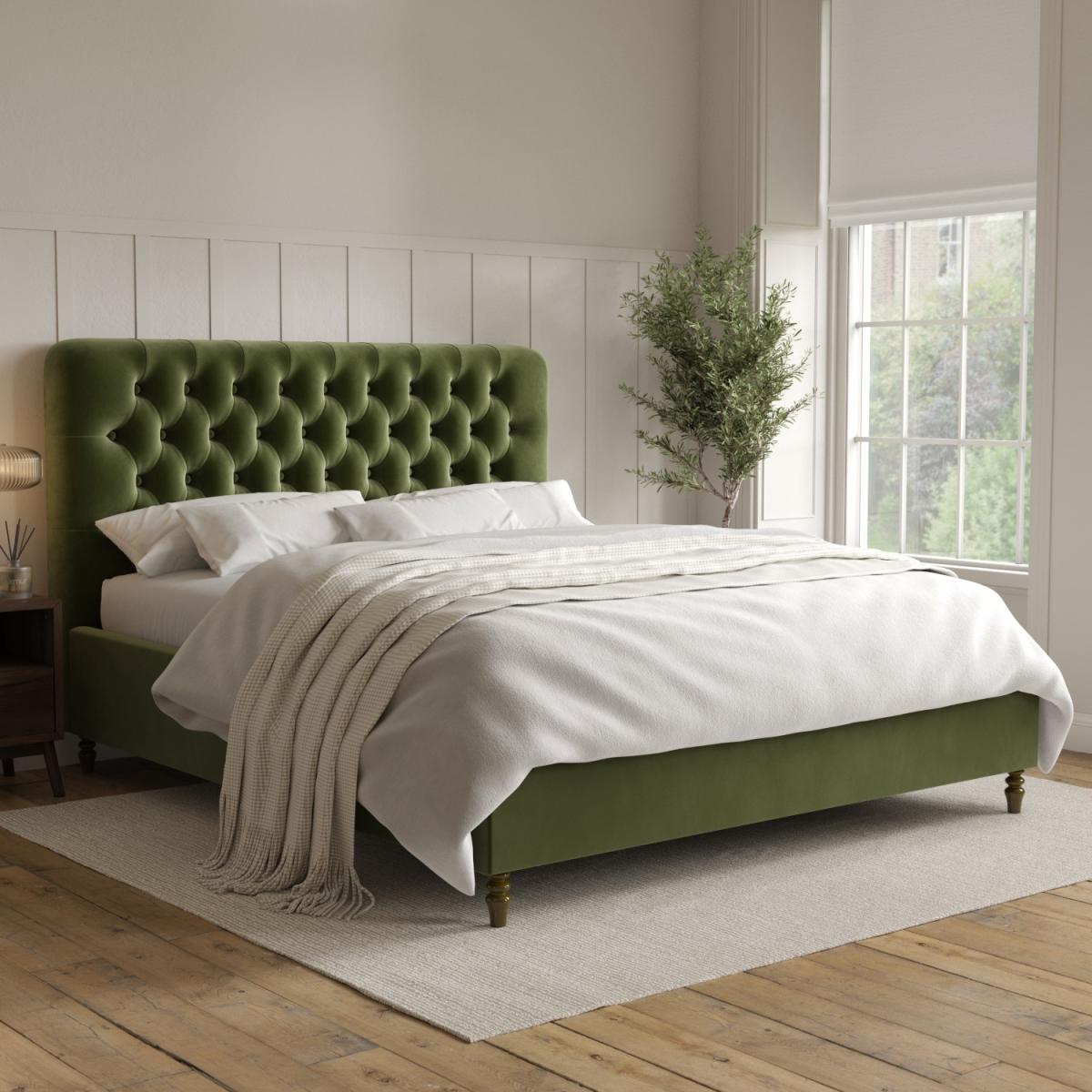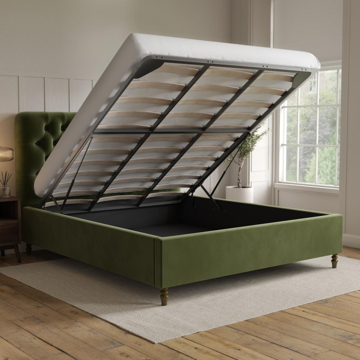 All about me Add a pop of colour to any modern bedroom with the Pippa ottoman bed in a stunning olive green colour, and the solid dark wood turned legs add a traditional touch. The end-opening ottoman is easy to access, and the fabric-lined base protects your stored items. It features a sprung-slatted base for ultimate comfort, and fits a standard UK super king size mattress. Need to know Dimensions:W192 x D216 x H126 cm Weight: 73 kg Mattress size: Standard UK Super king Size (6ft) Mattress included: No Gas lift supported weight: 75 kg Colour: Olive green Finish: Upholstered Material: Velvet fabric Bed base: Sprung-slatted Assembly required: Yes Packaging dimensions:Box 1- W196 x D136 x H16 cm, Box 2- W208 x D34 x H23 cm