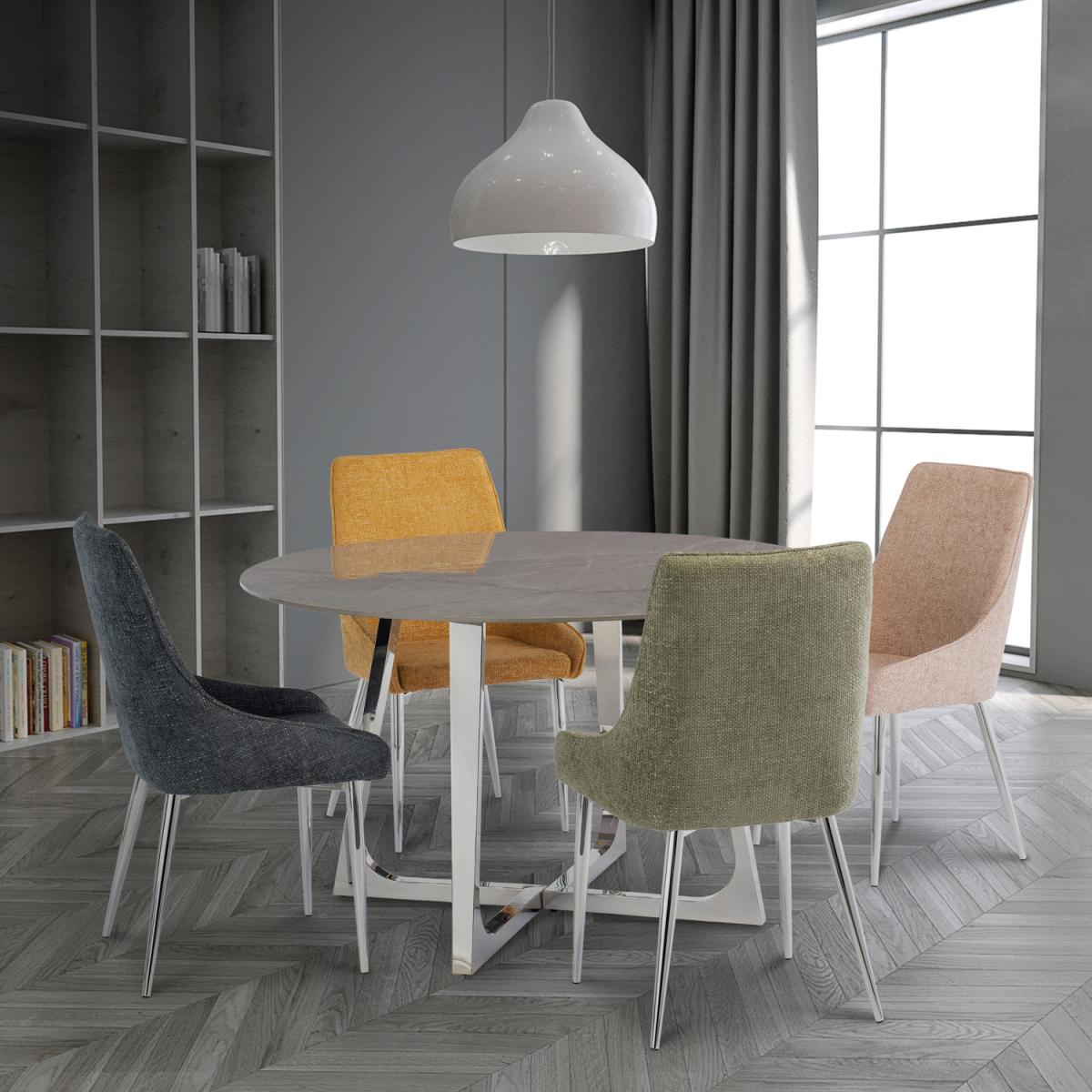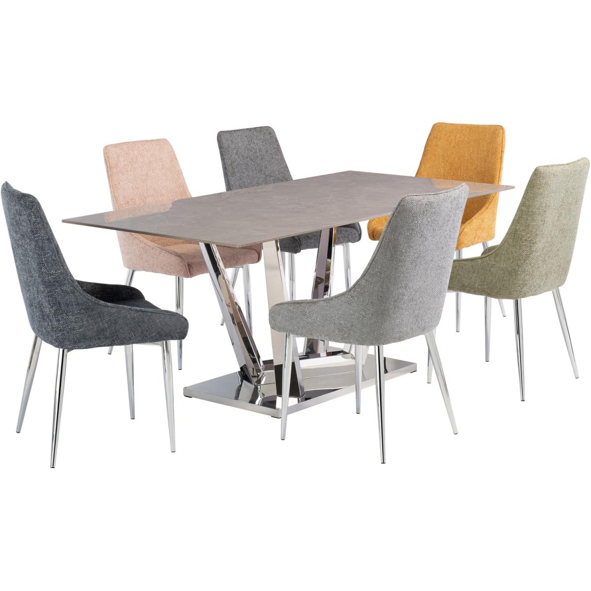 Soft, sumptuous and fashionably elegant. The Rhone dining chair is beautifully tailored with a textured fabric and piping design. Finished with polished chrome legs. They are delivered flat packed with required assembly.