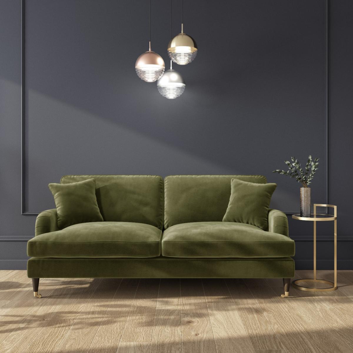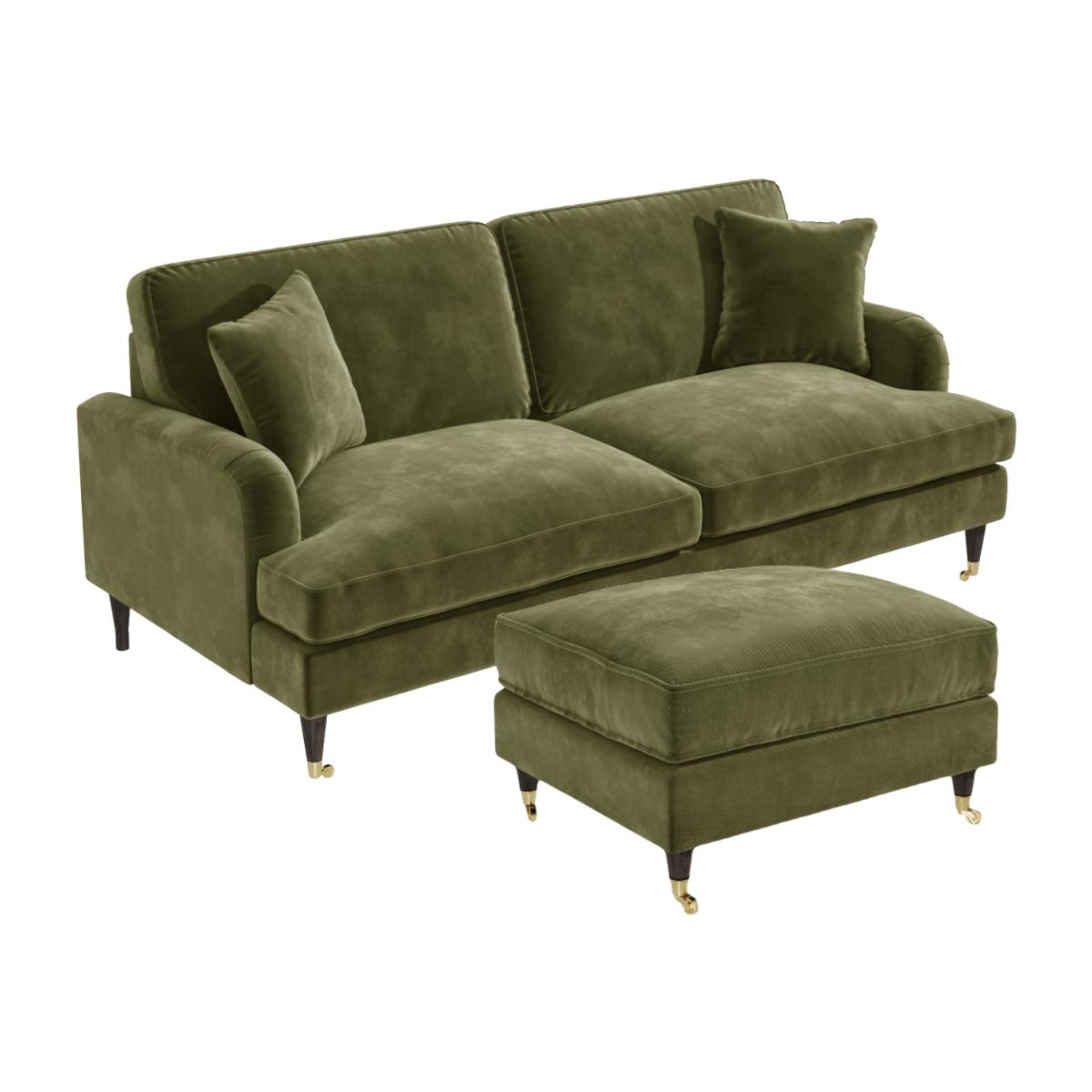 Foam filled Scatter Cushions Included This bundle includes: 1 x Olive Green Velvet 3 Seater Sofa – Payton 1 x Olive Green Velvet Footstool – Payton Features we love Olive green velvet 3-seater sofa and footstool set The sofa comes with two matching scatter cushions Removable cushion covers are easy to wipe clean The footstool can also be used as an additional seat Foam filled for super comfy living room seating All about me Create the ultimate cosy living room with this Payton olive green velvet set, featuring a 3-seater sofa and footstool. It's the perfect combination of style and practicality, the olive upholstery with gold accent legs adds a pop of colour while being the ideal place to relax with your feet up after a long day. Need to know Sofa Overall dimensions: W190 x D96 x H85 cm Seating dimensions: W164 x D60 cm Packed dimensions: W192 x D98 x H61 cm Packed weight: 54 kg Colour:Olive green Finish: Velvet upholstery and wooden legs Material: Velvet (100% polyester), wooden frame and legs and metal castors Filling: Foam Assembly required: Yes - just attach the legs Footstool Overall dimensions: W75 x D62 x H44 cm Packed dimensions:W77 x D64 x H31 cm Packed weight: 10 kg Colour:Olive green Finish: Velvet upholstery and wooden legs Material: Velvet (100% polyester), wooden frame and legs and metal castors Assembly required: Yes - just attach the legs