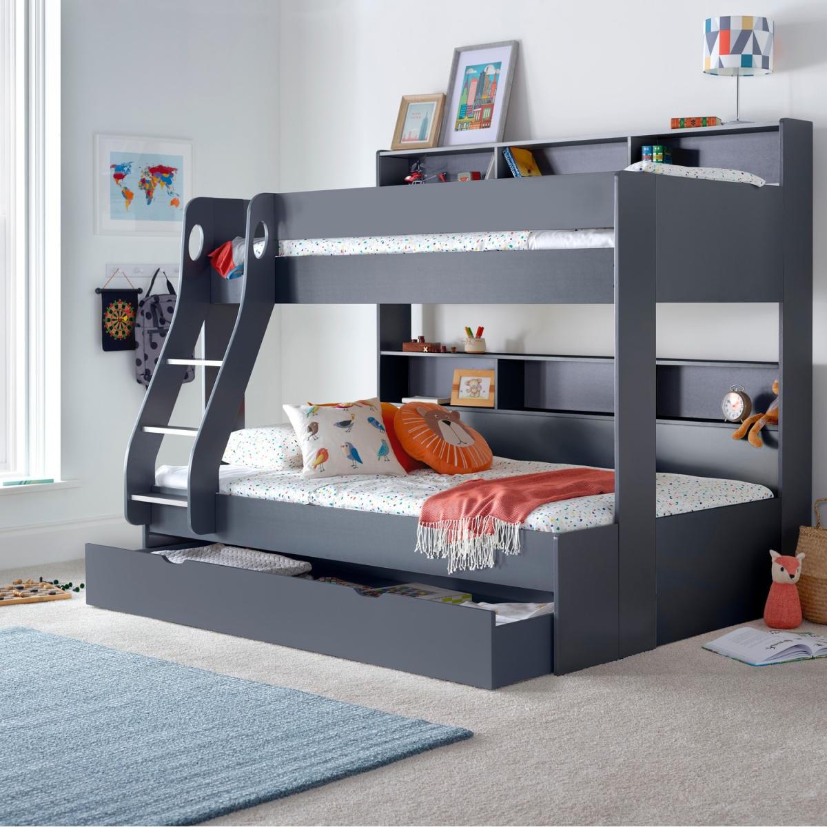 The Oliver Triple Sleeper is an amazing new bunk bed with a contemporary and versatile design. A perfect blend of style and practicality. Both top (single size) and bottom (small double) tiers come with shelves and dividers, which are perfect for books, toys and any other bedroom trinkets. The ladder on this bunk has cut-out handles and sits close to the frame. The lower bunk is also positioned close to the ground, making it safer for your child while also creating a more open feel in the room. This triple sleeper also features an optional pull-out storage drawer. This is the drawer version. Overall, a very adaptable and stylish bunk bed, making it suitable for any setting. The ladder can be assembled to fit left or right. Fits one Single and one Small Double mattresses. Made from solid Rubberwood and superior quality materials. Available in White, Onyx Grey or Grey and White. Supplied flat-packed to a room of choice. Self-assemblyly required. Pocket Spring Mattress Features Pocket Sprung Micro quilted Polyester fillings for comfort Tested to BS7177 Made in the UK Suitable for bunk beds Medium-soft tension 15.24cm depth
