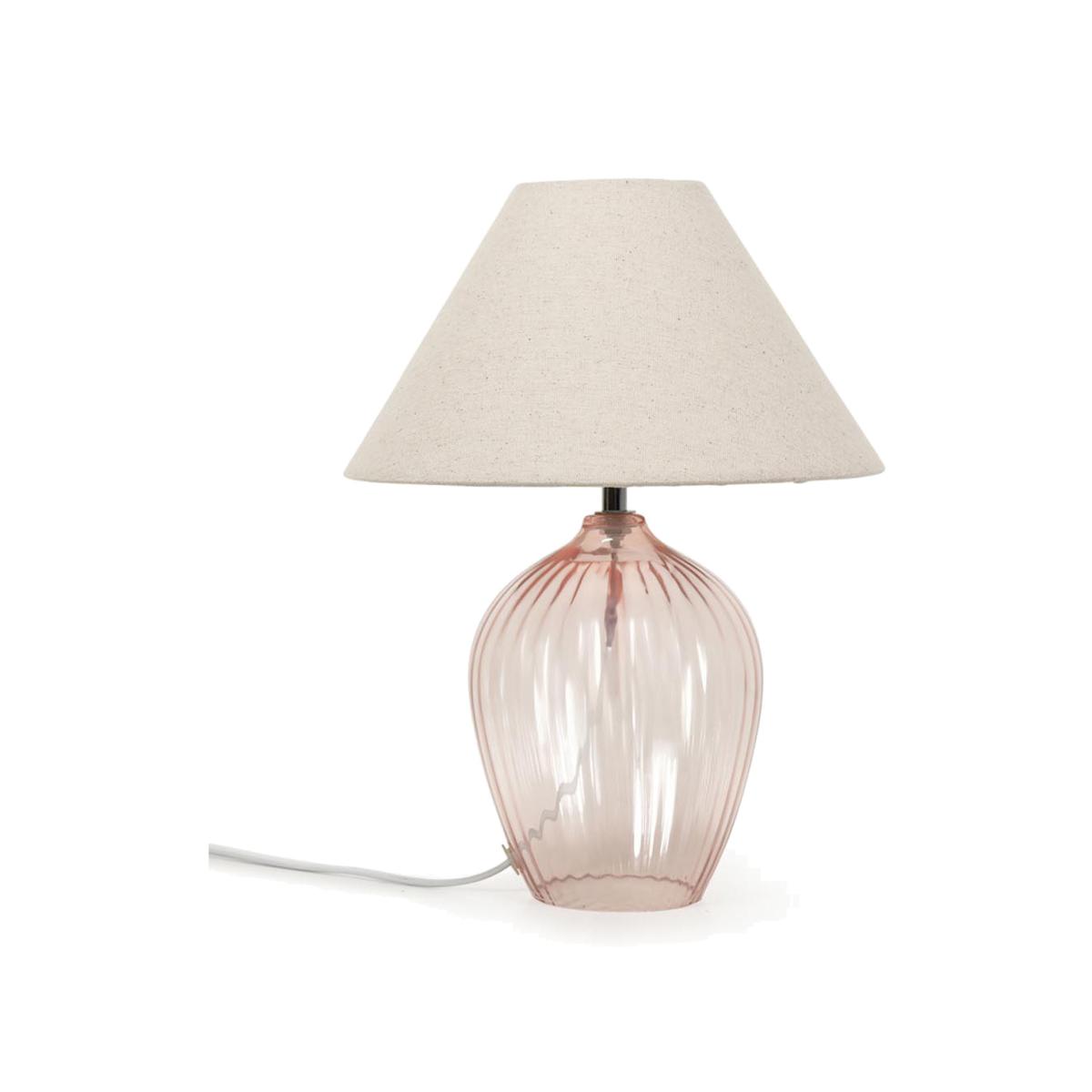 This table lamp features a glass base, perfect for adding a sleek and contemporary touch to any space. Complete with a fabric tapered lampshade in a natural finish. The in-line rocker switch provides convenient control, making it easy to illuminate your space. Available in a blush or grey finish, this lamp will illuminate your home while creating a visual point of interest. Airy and modern, this grey glass table lamp gives you illumination without obstruction, allowing light to move throughout the base. Topped with a fabric lamp shade. Dimensions:Height 34cm, Depth 29cm, Diameter 14cm Requires one 4W SES E14 LED bulb. Rocker switch on a 1.6m cable.