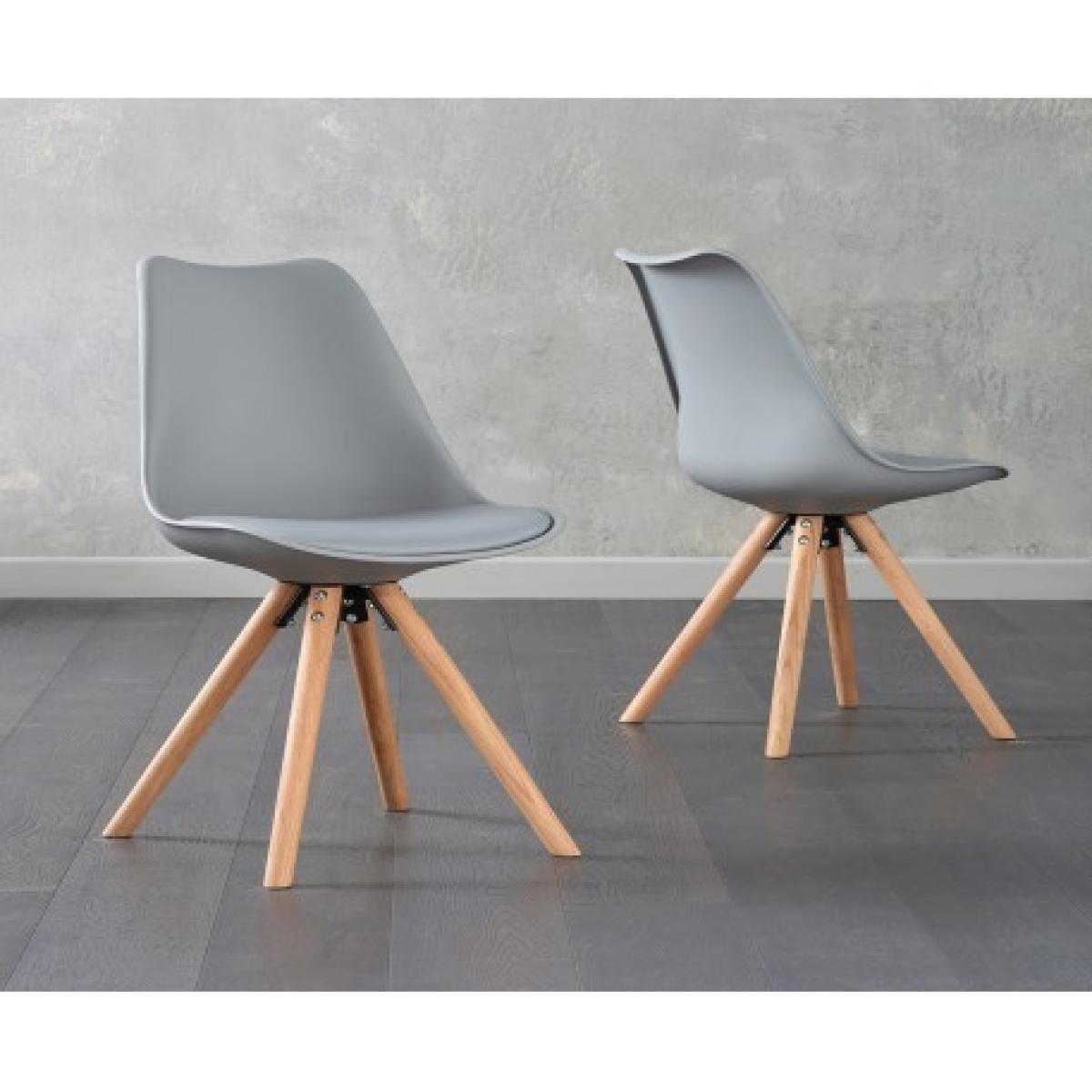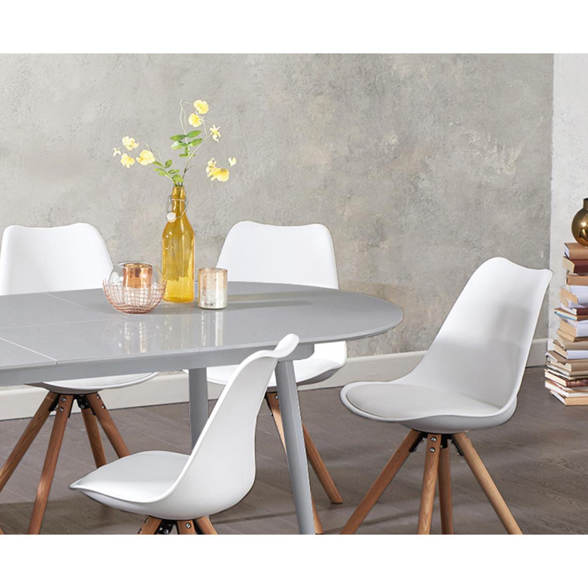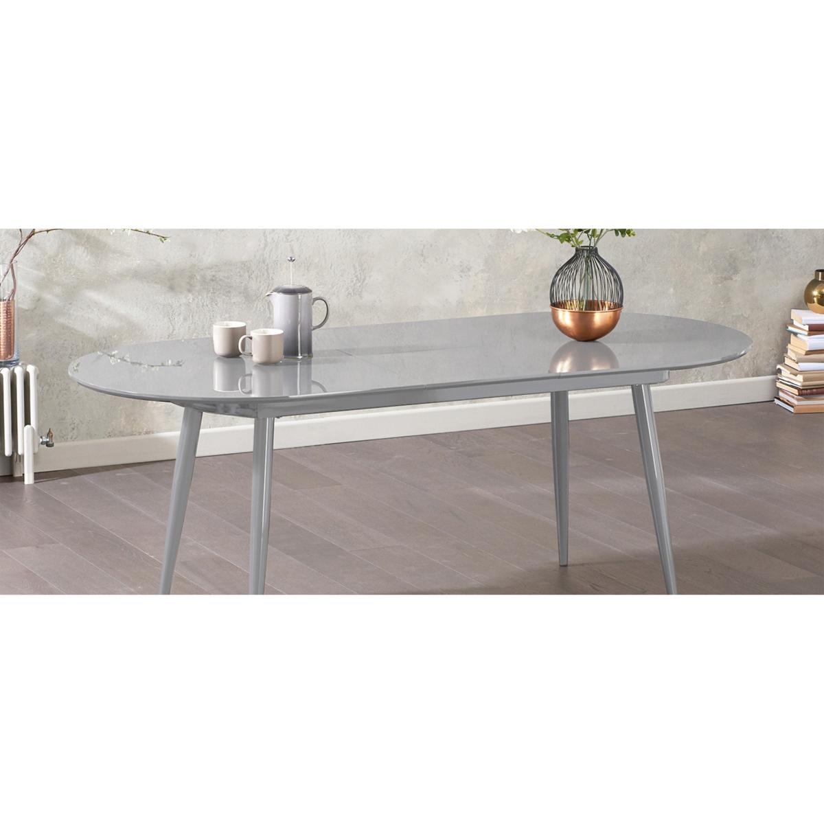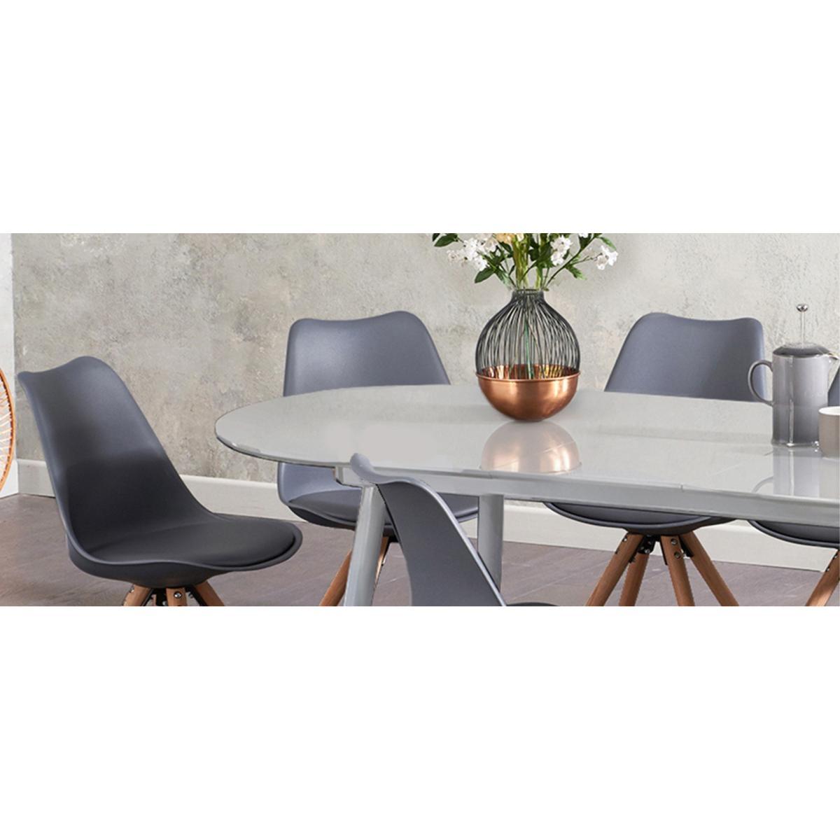 The Olivia Extending Light Grey High Gloss Dining Table with Oscar Faux Leather Round Leg Chairs is a contemporary dining set that brings style and versatility to every occasion. The durable and practical high gloss dining table extends to comfortably seat 8 people while stylish Oscar Chairs boast padded faux leather seats and sturdy oak legs. Contemporary light grey high gloss dining table is a stylish setting for every occasion. Stylish and versatile, the table extends from 160cm to 200cm to seat 8 diners. Durable engineered wood construction finished with smooth light grey gloss for a sophisticated modern look. Convenient inbuilt butterfly extension feature creates additional space in momentsAB S standard Oscar Chairs complement the table and feature faux leather padded seats and sturdy oak legs