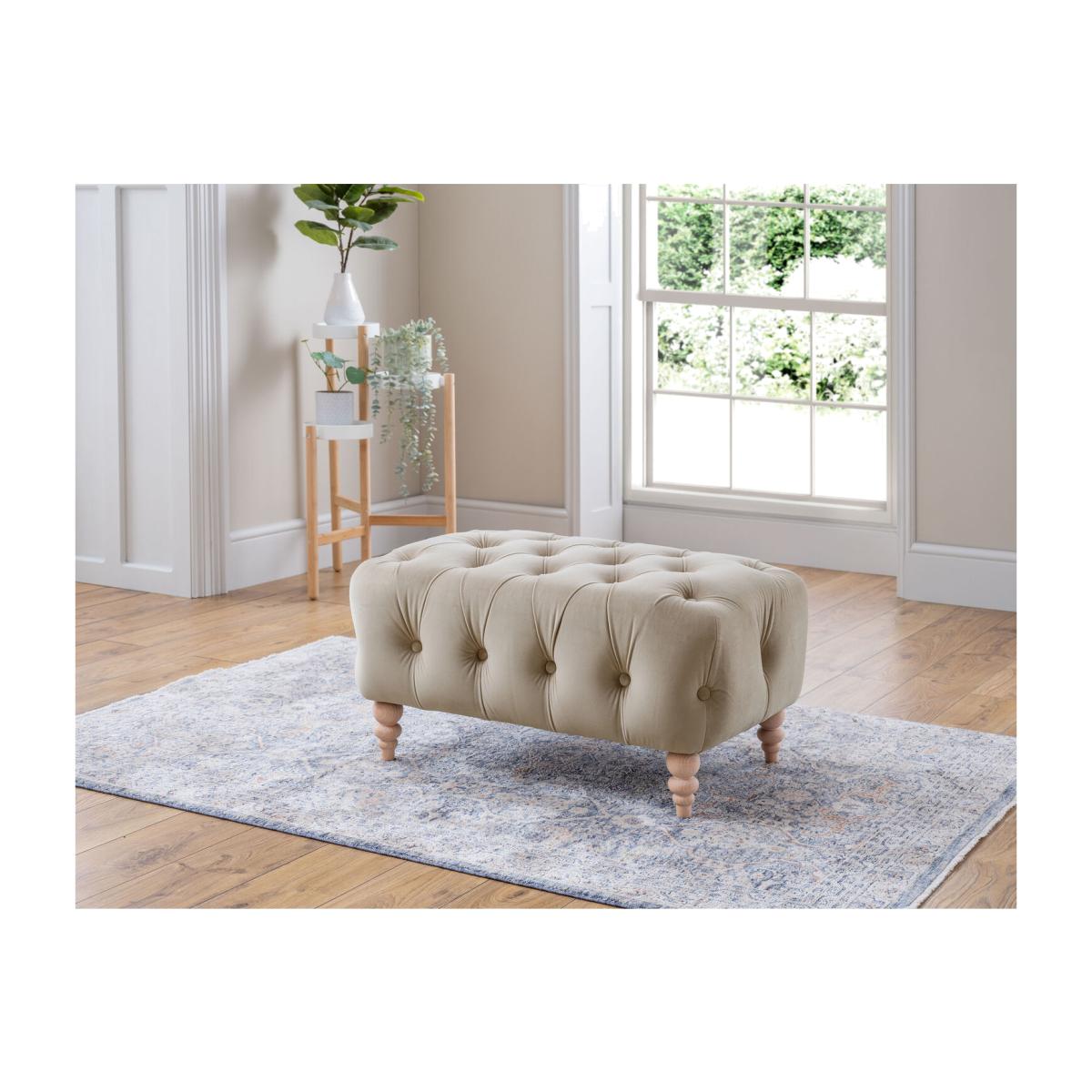 Our Olivia velvet footstool is designed to match our Olivia sofas and armchairs. A classic Chesterfield style upholstered velvet footstool featuring button tufting with diamond stitching, in a modern and on-trend velvet, sat on 4 pale wood turned legs. Constructed from a sturdy wooden frame, and finished with a lovely padded seat so you can pop your feet up and relax. Available in a range of colours. Check out our full living room furniture range to complete the look.