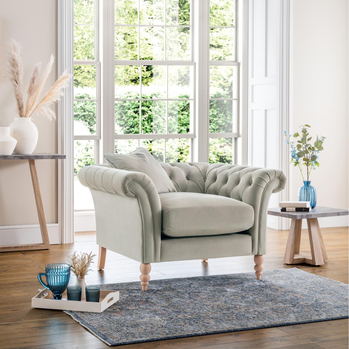 Our Olivia velvet armchair is our modern take on a classic Chesterfield sofa design and will be a lovely addition to your living room. Featuring a shallow sit-up-and-read style seat with gorgeous button-tufting diamond stitching to the back and elegant scroll arms, bought up to date with sumptuous velvet and pale wooden legs. The combination of materials, colours and design means the Olivia straddles both timeless and contemporary style with ease. Constructed from a sturdy wood frame, upholstered in soft touch velvet and feather-filled cushions, finished with turned wooden legs to the front and straight legs at the back - all creating a snug, comfy place to curl up and relax. Matching 2 and 3 seater sofas and footstools available, so check out our full Olivia range for more ideas. We're also pleased to announce that our delivery drivers will not only attach the legs for you on arrival but also remove all the packaging and take it away for you, making the process even easier!