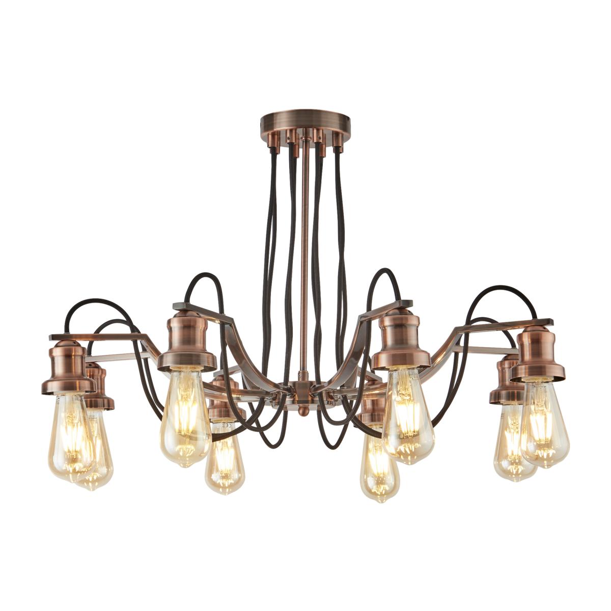 This striking 8 light pendant has a stunning vintage inspired antique copper finish. Alongside the antique copper fitting, there are black braided fabric cables which add a rustic feel to this centrepiece item. The 8 exposed bulbs create a wide spread of light and look stylish. Let the light take centre stage by placing on a high ceiling in a large room.