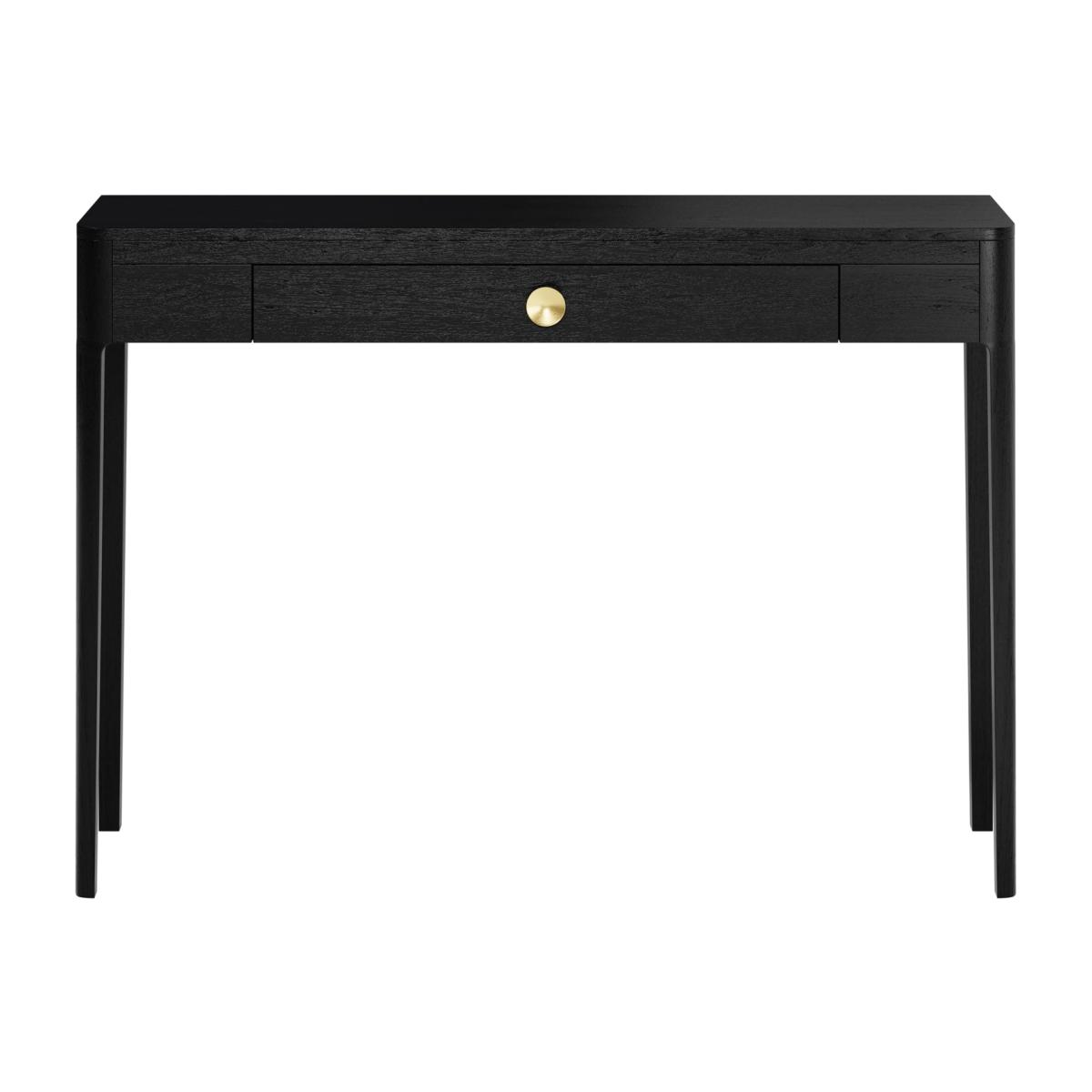One drawer black console table in dark stained solid oak and oak veneer, curved front, curved legs, cut lines, visible grain, metal runners on drawers and brass style round handle Dimensions: L:120 x D: 30x H: 85 cm
