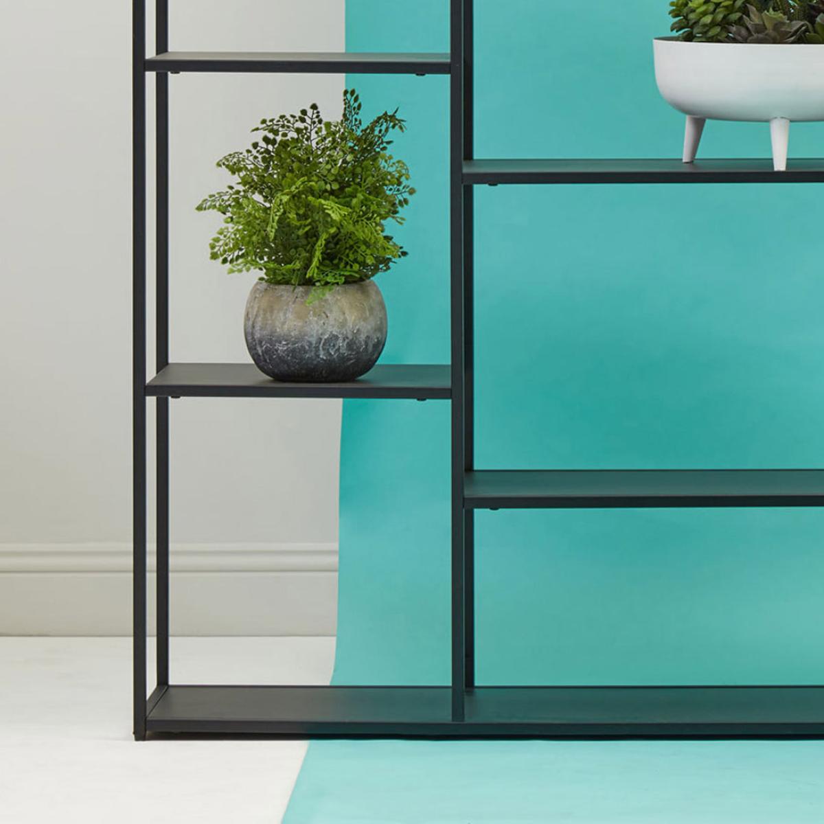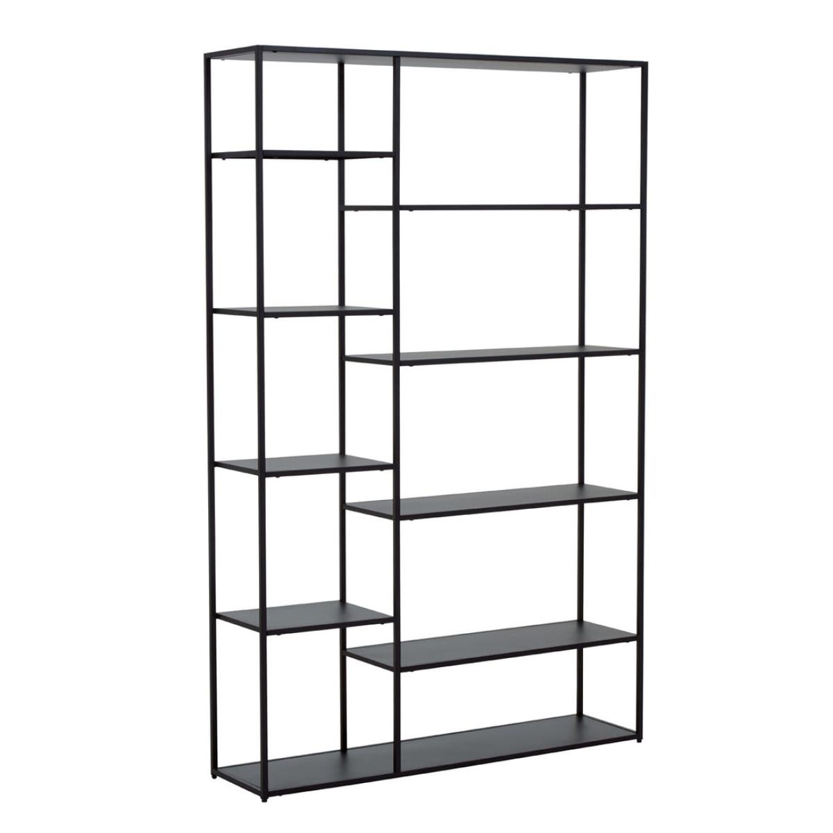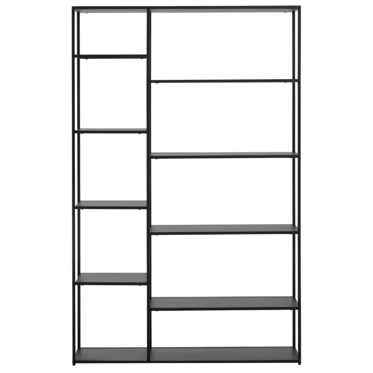 Made from sturdy black metal in black powder coating, this shelf unit features multi level shelves which make it easy to organise and display items. The large and small shelves are defined by clean and minimalist lines which combine to create openwork. Dimensions: H: 188 x W: 120 x D: 30 cm Materials: Metal Assembly Required:Yes Care Instructions: Clean with a soft dry cloth