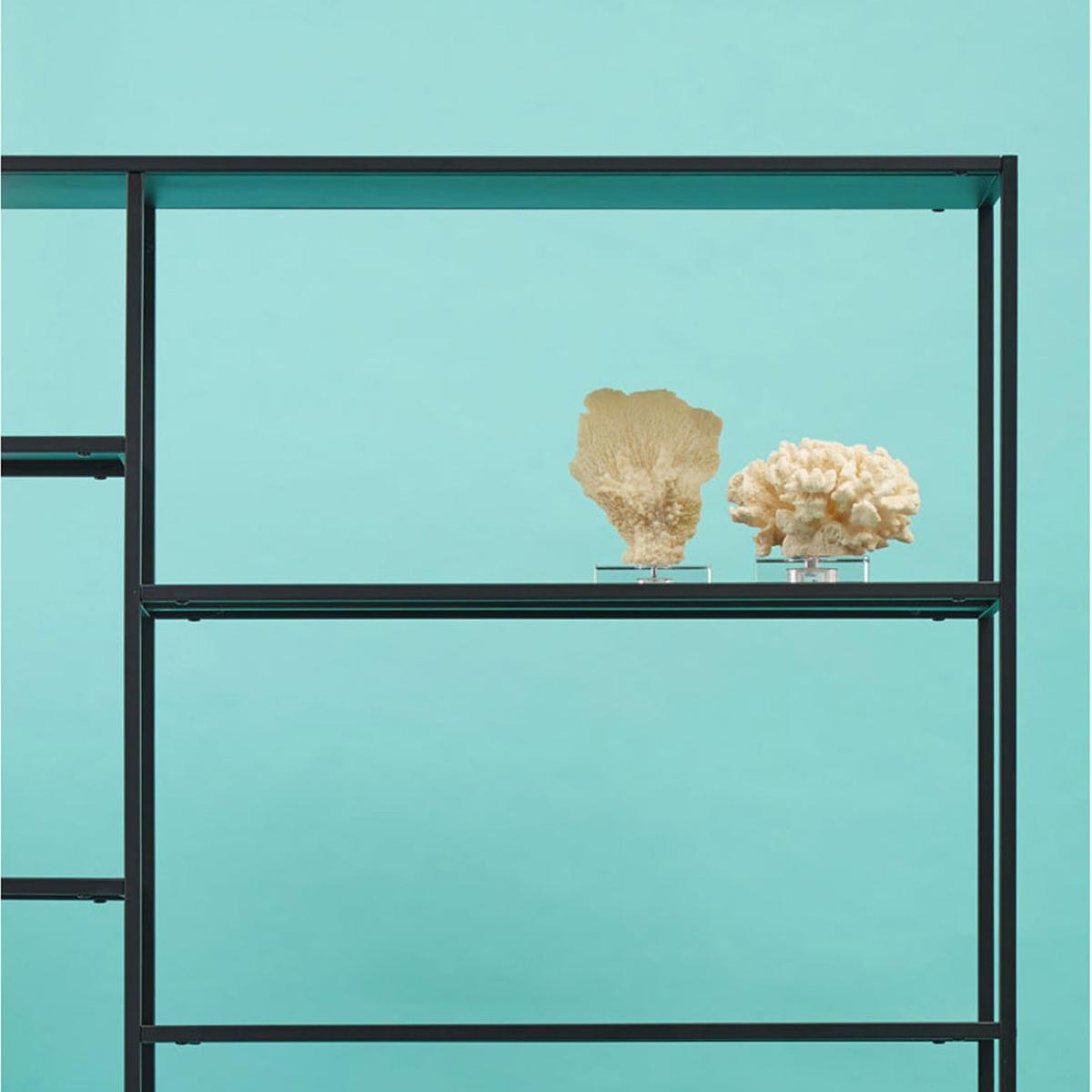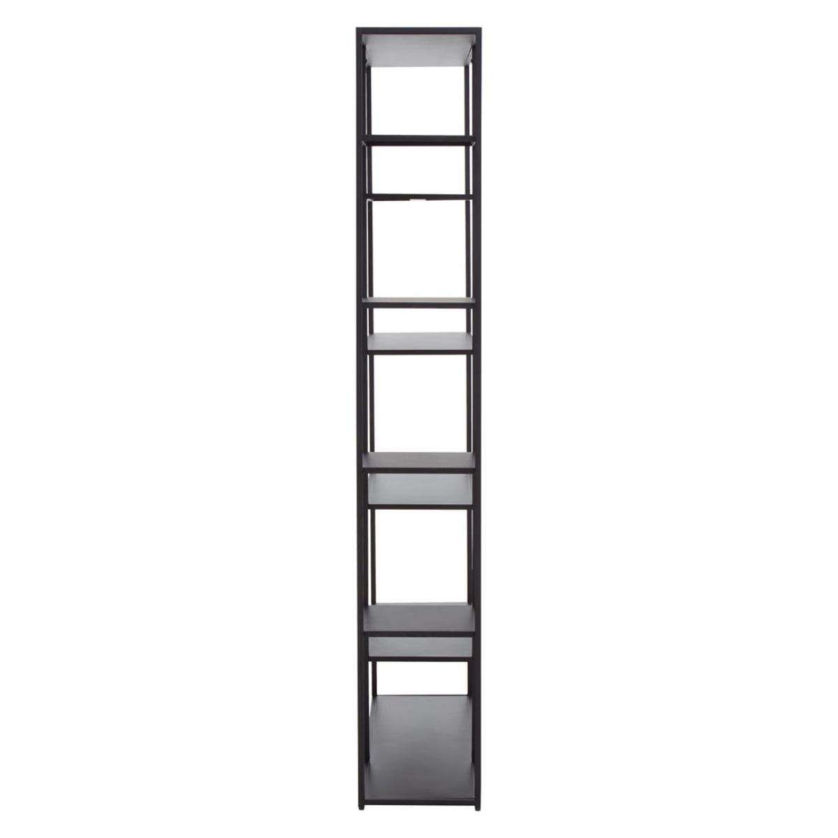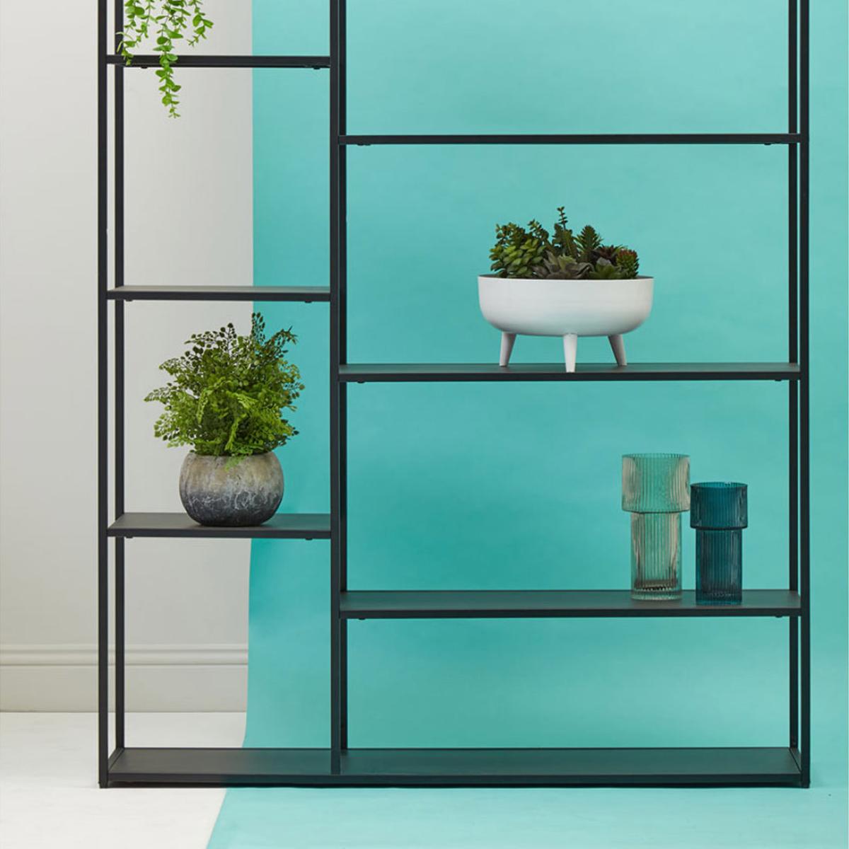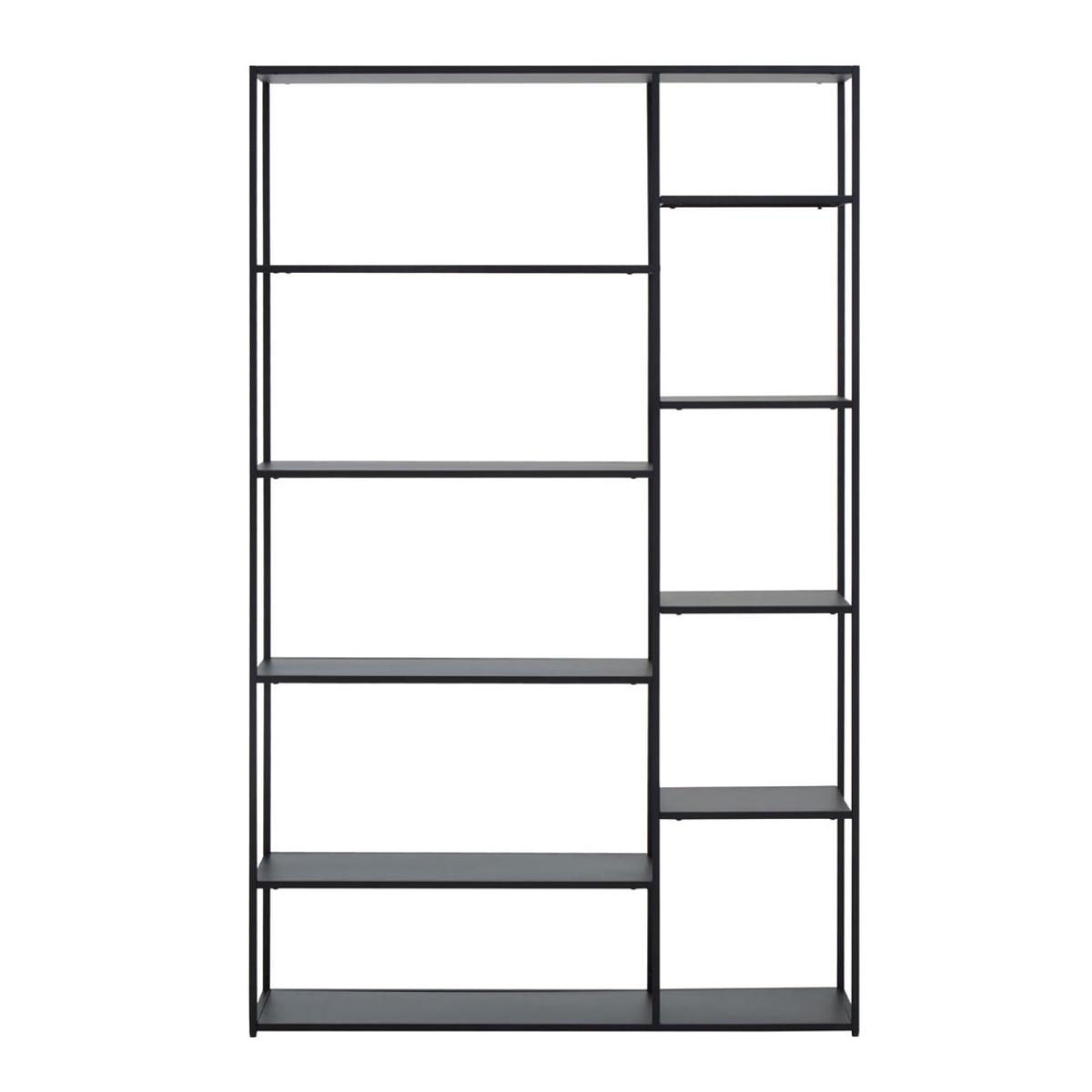 Made from sturdy black metal in black powder coating, this shelf unit features multi level shelves which make it easy to organise and display items. The large and small shelves are defined by clean and minimalist lines which combine to create openwork. Dimensions: H: 188 x W: 120 x D: 30 cm Materials: Metal Assembly Required:Yes Care Instructions: Clean with a soft dry cloth