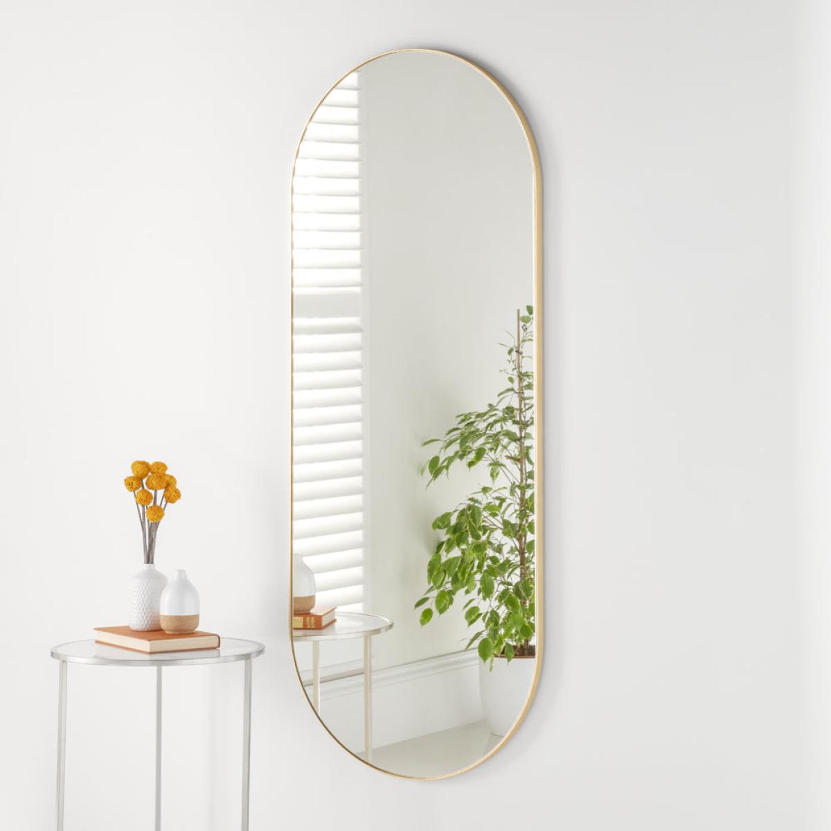 Both minimal and classically glamorous, the Olivia's Andora Wall Mirror Gold Leaf will bring functionality and style to any room. Its shape is a distinctive combination of rectangle and oval, round. View More. Both minimal and classically glamorous, the Olivia's Andora Wall Mirror Gold Leaf will bring functionality and style to any room. Its shape is a distinctive combination of rectangle and oval, rounded at each end with straight sections in the middle portion. Beautifully crafted to the highest standards, the mirror features a luxe gold border for a warm metallic accent. The combination of light-reflecting silver surface and rich gold is an enduring design duo that will make a lasting impression in any setting and immediately make any room look brighter and more spacious. Its generous height of 150cm makes it a brilliant addition to any boudoir.