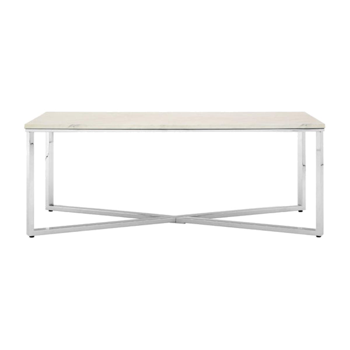 Its smooth metal legs are given a rich sleek chrome finish and intersect at the base to create a continuous, flowing look. This exquisite piece works well with boutique hotel style furniture and accessories. The rectangular tabletop is made from smooth faux marble, with flecks of grey adding a darker hint to the white. Dimensions:W:120 x D:60 x H:45 cm Materials: Faux Marble, MDF, Metal, Paper Assembly Required:Yes