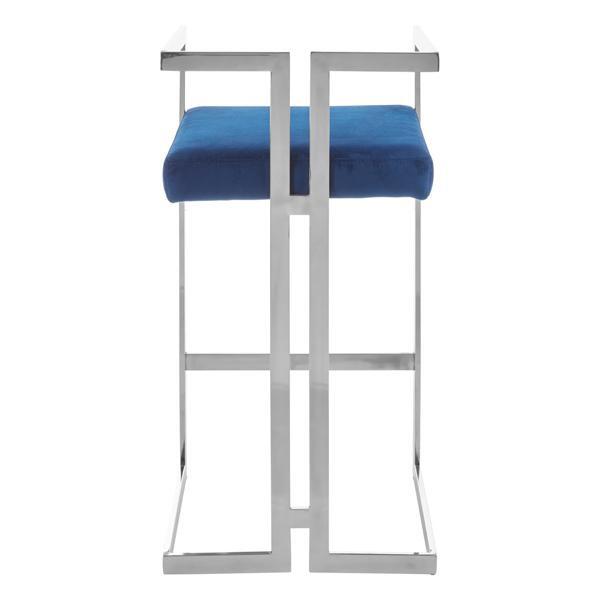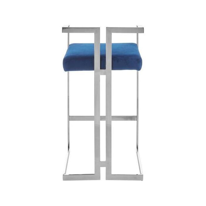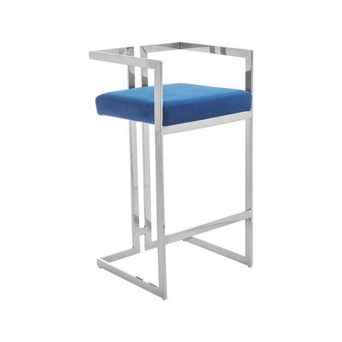 The seat and backrest of the Anna bar stool are dressed in sumptuous blue velvet. its stainless steel frame has a slightly minimal feel and a luxurious gold or silver finish. Angled armrests and a footrest create a comfortable sitting experience.