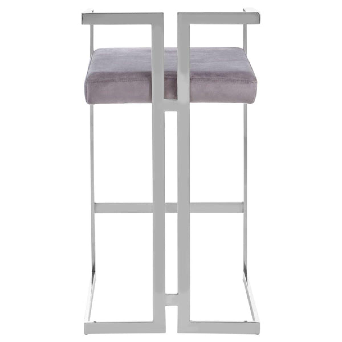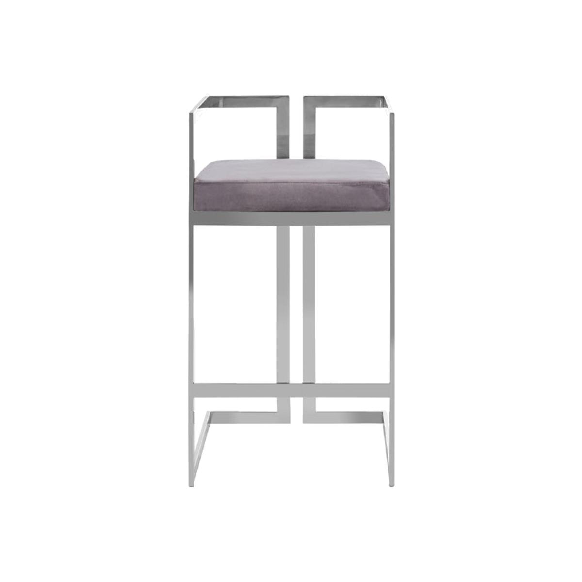 The seat and backrest of the Anna bar stool are dressed in sumptuous grey velvet. Its stainless steel frame has a slightly minimal feel and a luxurious gold or silver finish. Angled armrests an. View More. The seat and backrest of the Anna bar stool are dressed in sumptuous grey velvet. Its stainless steel frame has a slightly minimal feel and a luxurious gold or silver finish. Angled armrests and a footrest create a comfortable sitting experience.