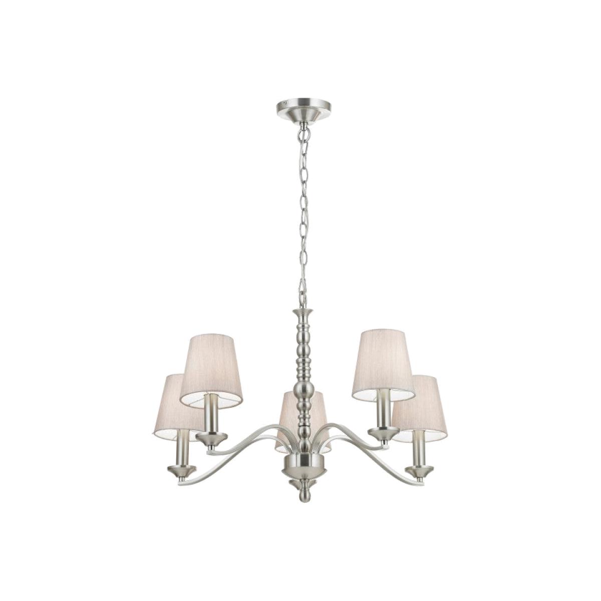 Transform your home into an elegant haven of luxury and style with the simply stunning Olivia's Astaire Chandelier. The five delicately stylish shades are showcased in a fresh crisp white, while the soft curves of the main frame are in a simply stunning sleek silver. Supported by a simplistic chain, also in stylish silver, this elegant statement piece will create the vibe of a French chateau with its effortless attractive design and classic timeless beauty. While it features a fresh contemporary appearance, it is also suited to more traditional interior design styles and tastes, ensuring it will uplift any space. Dimensions: H:46.5 x D:75 x W:75 cm / Shade Dia: 13cm. Drop: 46.5 - 152cm. Bulb Type: 5 x 40W E14 Candle (Dimmable) - Not included. Cable Length: 100cm Materials: Fabric, Steel