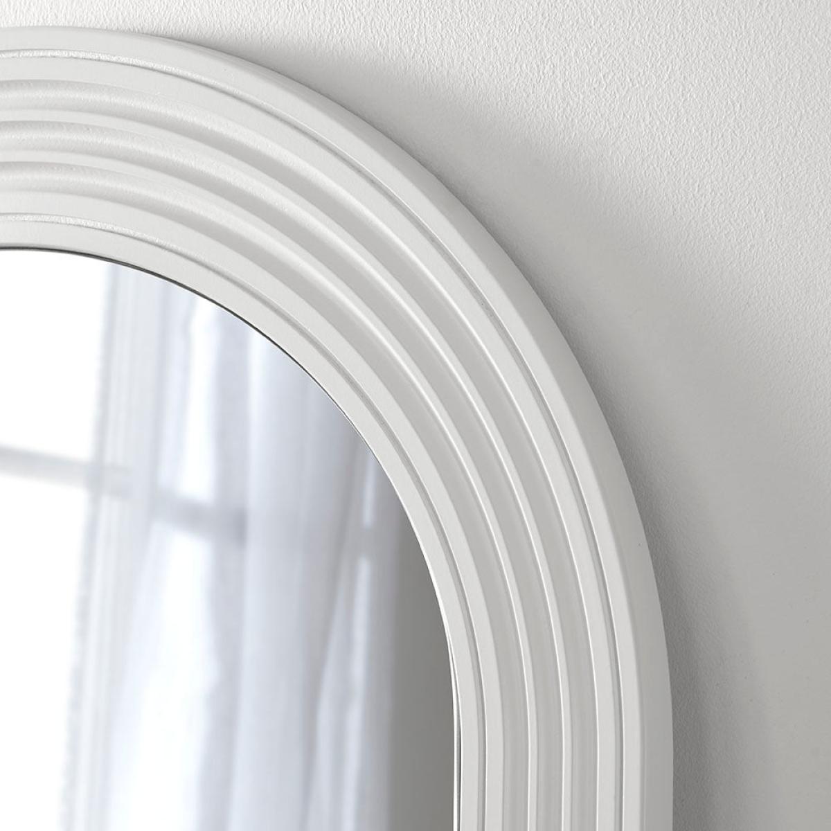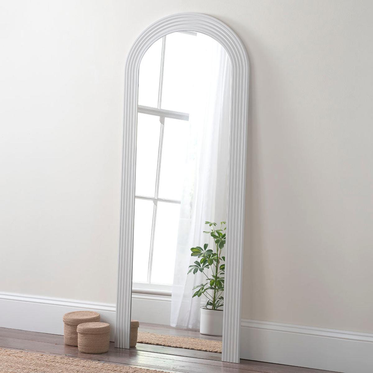 The Olivia's Atlas Arch Full Length Mirror in White brings a bohemian elegance to any space. Its full-length arch and distinctive reeded, endless design frame in an understated white are eye-catching. This mirror, handcrafted by skilled artisans in the UK, is designed for easy wall mounting with included hooks and offers superior reflective qualities. Additional Information