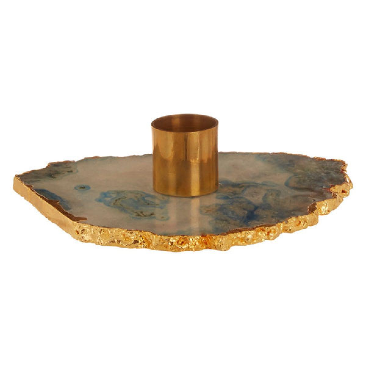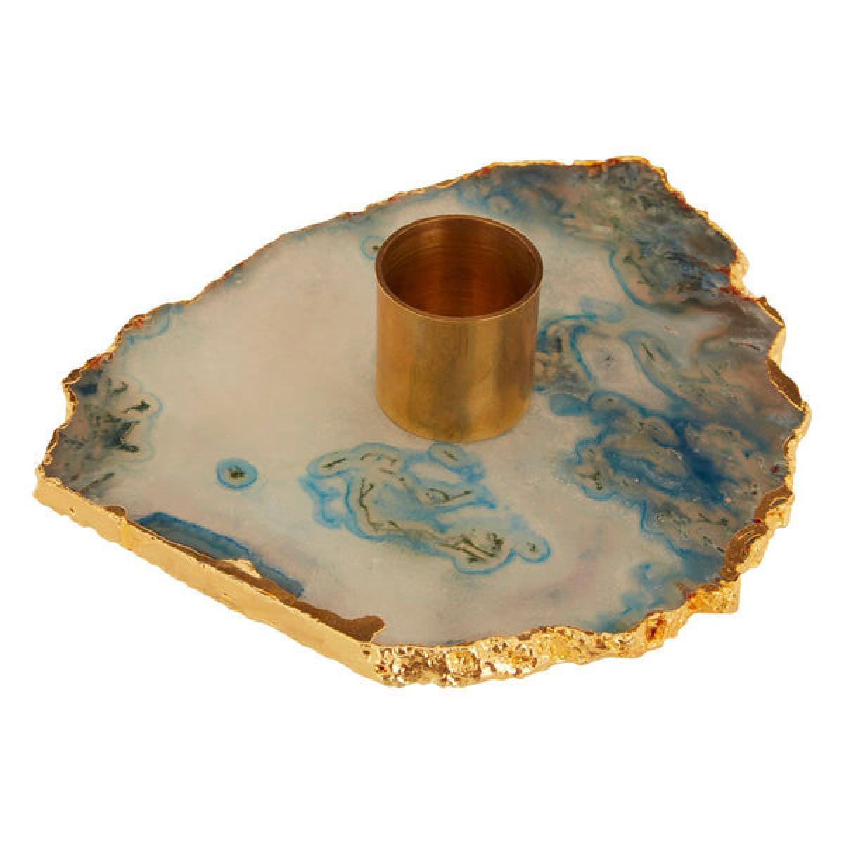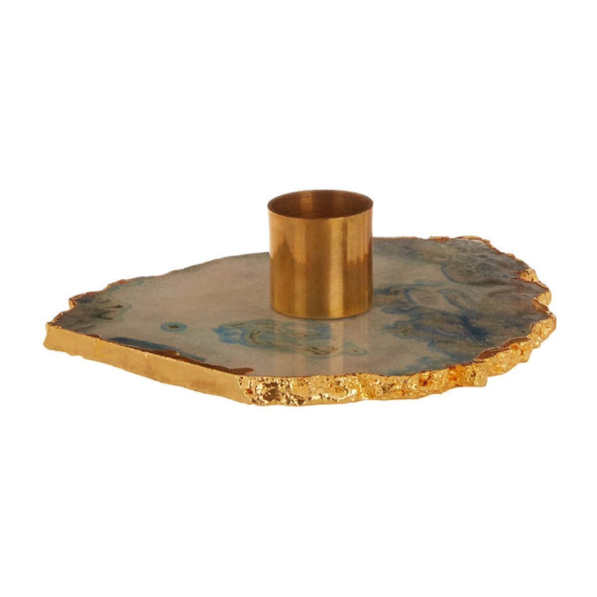 Natural agate gemstone in banded pattern with gold foil surrounding the asymmetric trim. The cylindrical, warm metallic candle holder sits above the semi-precious stone, while it creates tonal harmony with the luxe edging. *Moot Trading Ltd is not a lender and acts only as an introducer. The credit product is provided by Klarna Bank AB (publ). Credit is only available to permanent UK residents aged 18 and over, subject to status. Terms and conditions apply. Please note that the following products are not regulated by the FCA: Pay in 30 days and Pay in 3 instalments. Read More.