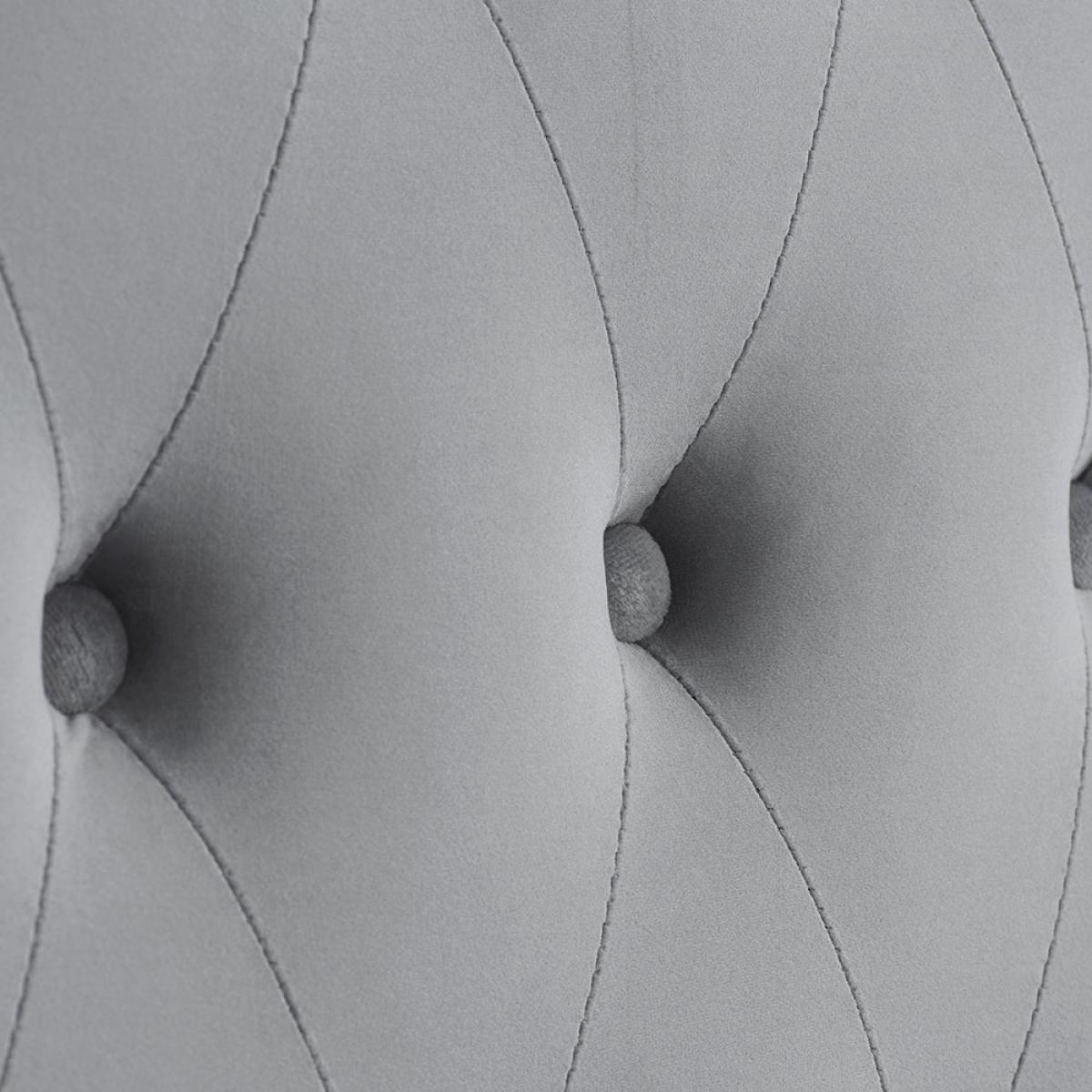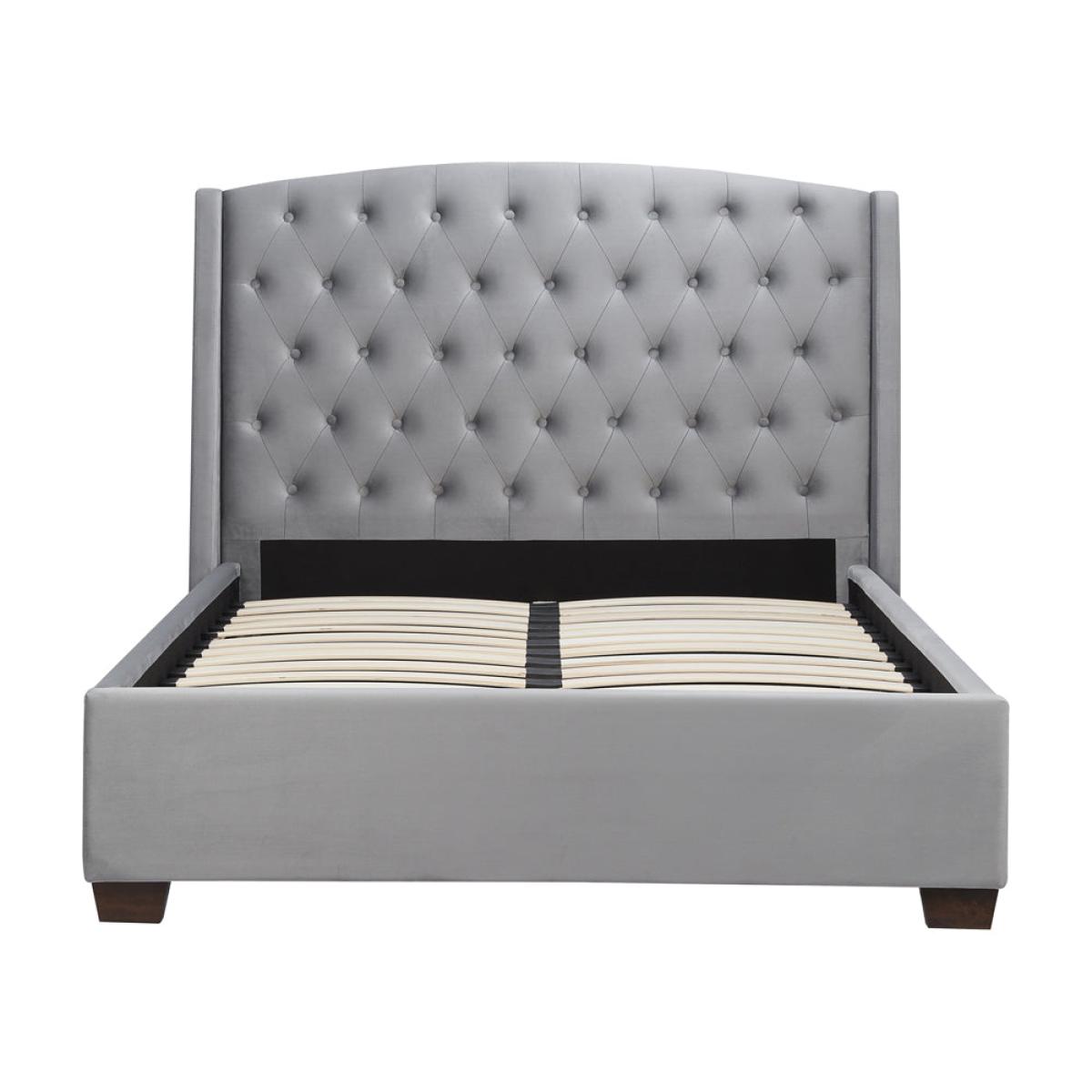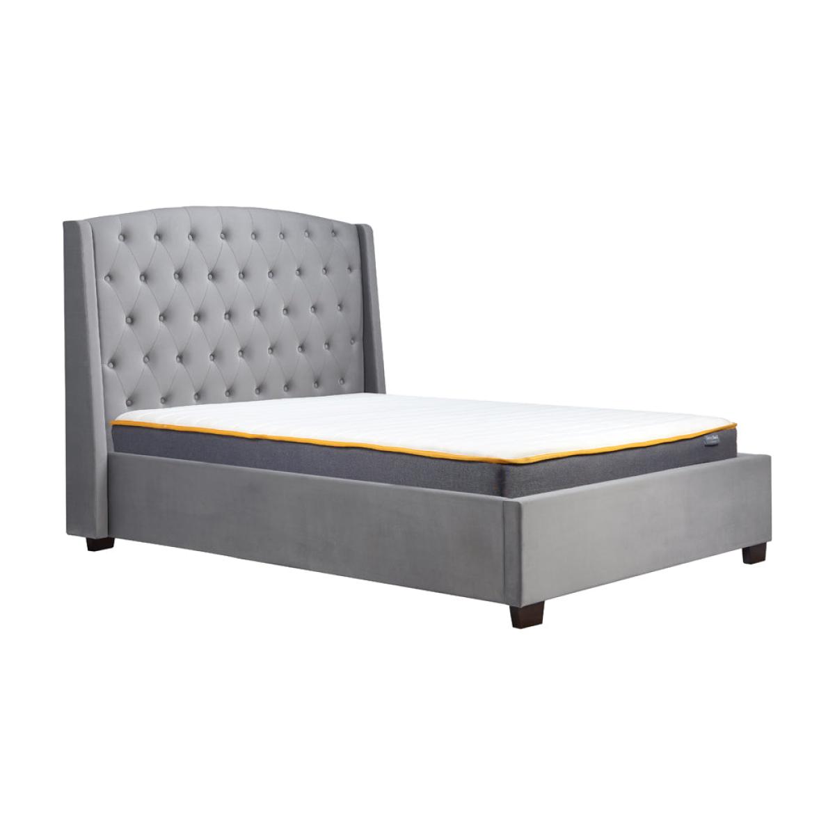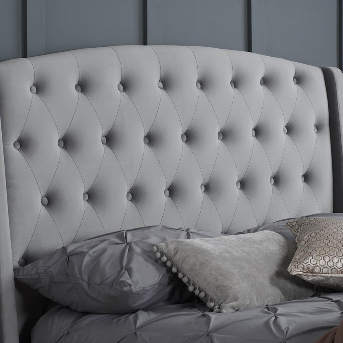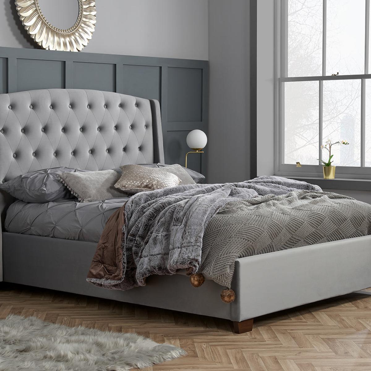 Make a grand style statement with this elegant contemporary bed frame. The Bailey bed is upholstered in a luxurious grey velvet and features a wingback headboard with beautiful tufted detailing. Featuring a sprung slatted base to give natural bounce, this bed adjusts to where pressure is most exerted for greater comfort. Add a touch of elegance to any style bedroom with the Bailey Bed! The maximum weight load for the 4"6 frame is 300 kg, the 5" frame is 400 kg, and the 6" frame is 450 kg. Please note: Olivia's beds are only suitable for a UK standard size mattress and the recommended maximum mattress height is 305 mm. Dimensions: Double - H: 130 x W: 160 x D: 209 cm. Kingsize - H: 130 x W: 174 x D: 220 cm. Super Kingsize - H: 130 x W: 203 x D: 220 cm Materials: Polyester Assembly Required: Yes Care Instructions: Fabric can be gently brushed or lightly vacuumed to remove any dust. With any spillages, take immediate action to remove excess liquid. Do not rub or use any detergents. Always follow cleaning instructions included in the assembly instructions