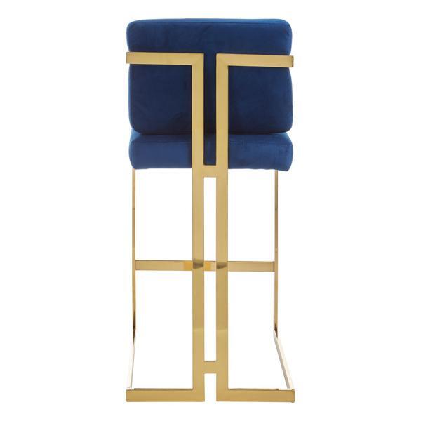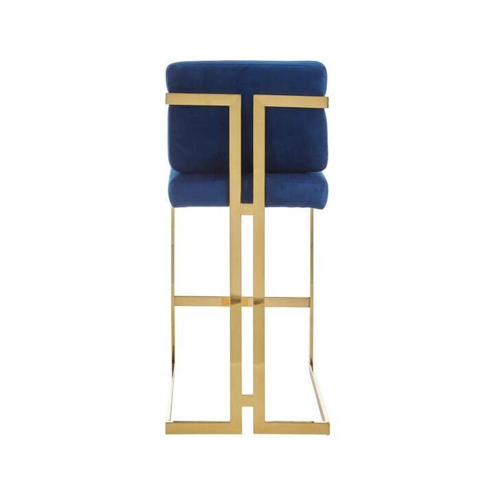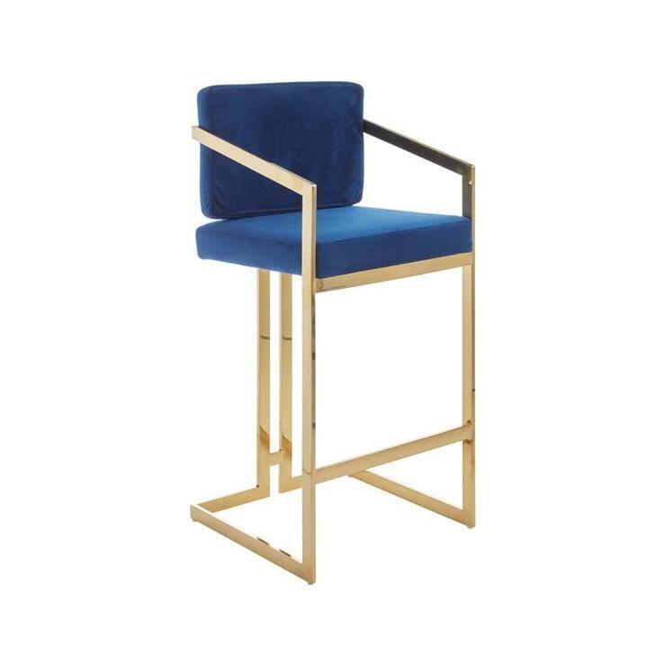 The seat and backrest of the Anna bar stool are dressed in sumptuous blue velvet. its stainless steel frame has a slightly minimal feel and a luxurious gold or silver finish. Angled armrests and a footrest create a comfortable sitting experience.