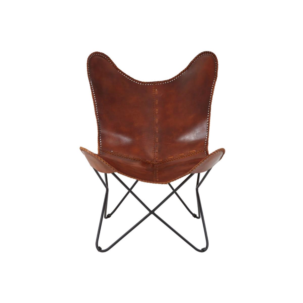 Its sling seat and distinctive butterfly frame combine to create a laid-back aesthetic. The frame is made from strong iron and sports a sleek black finish. Contrasting this minimalist design is the genuine tan leather seat, soft to the touch and featuring bold stitched detail for a slightly rugged finish.