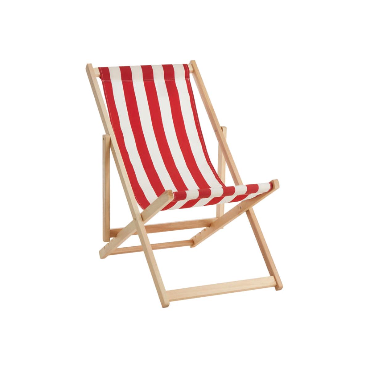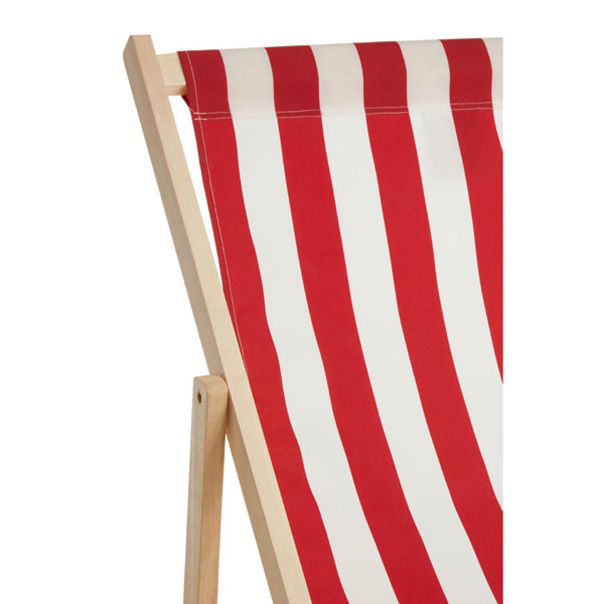This chair has a tough, solid hardwood frame which has a natural colour that gives it a fresh and light appeal. Notches in the rear legs allow the seating position to be adjusted from a lazy recline to a more upright style. The cream and white striped sling means that it adds a subtle and modest accent to the patio and garden. We would recommend that this furniture be covered or brought back inside when not in use. They should not be left exposed outside. Dimensions: W:59 x D:86 x H:100 cm