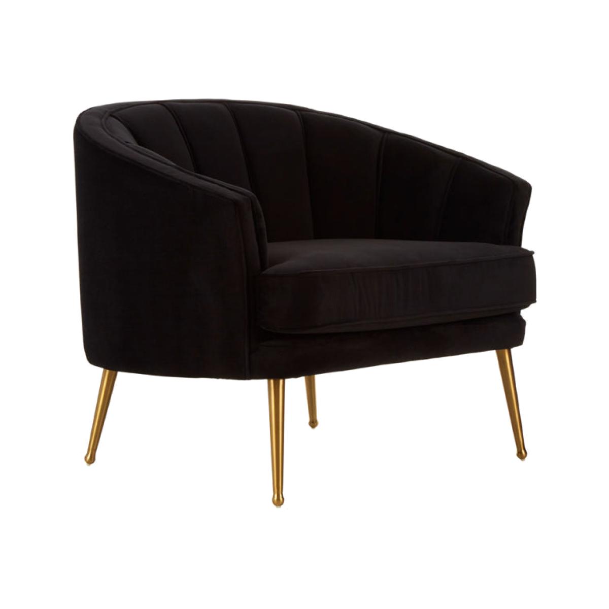 This sumptuous easy-chair is finished in a deep black velvet and supported on slender tapered legs with ball feet, finished in contrasting gold. Combined with the gracefully sweeping curve of the one-piece back and arm rests this is an elegant and inviting chair. Thick padding and neat vertical pleats add to its luxurious appeal. The dimensions are generous too: the chair is 94cm in width and 80cm deep, which means you can choose to sit back and relax or comfortably swivel to engage in conversation. This style is often seen in boutique hotels but will be just as inviting in a lounge or dressing room. Dimensions: H:80 x W:94 x D:80 cm