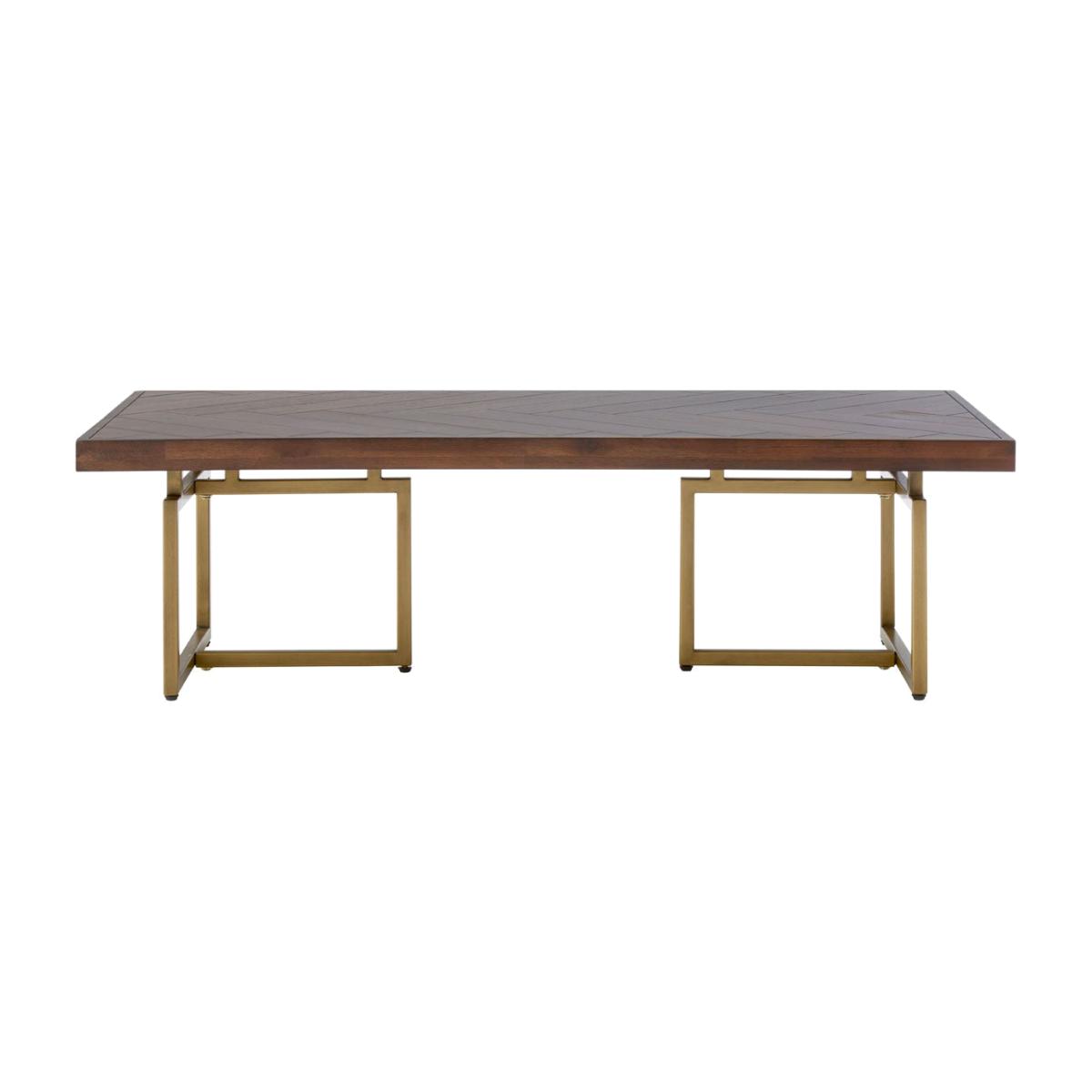 Gorgeously minimalist yet stunningly versatile, the Brooklyn Coffee Table is a piece that is sure to shine and catch some eyes in your home. The table itself is made of sleek, rustic wood, bringing a classical and highly traditional feel to the piece, prized for it's prominent grain patterns and rich natural tone. The unique design of the table legs - made with a beautiful antique brass - adds an artistic flair and combines the traditional with a hint of the contemporary. This amalgamation of the traditional table top with the antique yet artistic legs makes for a piece of homeware that is beautiful in addition to being highly functional in your home. Dimensions:W:120 x D:60 x H:35 cm Materials: Acacia Veneer, Metal, MDF Assembly Required:Yes. Care:Wipe with a soft dry cloth. No harsh abrasives